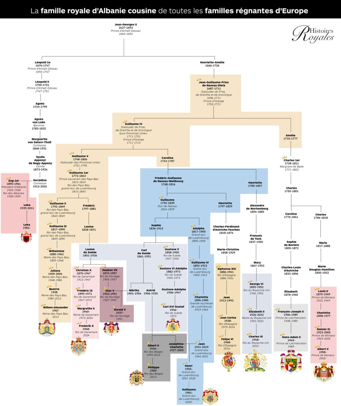 Ahmet Zogu (1895-1961), fils du gouverneur Jamal Pasha Zogu, est devenu premier ministre de l’Albanie en 1922. Il est élu président en 1925 et s’est autoproclamé roi des Albanais sous le nom de règne de Zog 1er, en 1928. La famille royale d’Albanie est donc récente et bien que plusieurs membres de la famille aient assuré des hautes fonctions dans le pays au fil des siècles, elle ne partage initialement aucun cousinage avec les autres familles royales européennes. Le 27 avril 1938, le roi Zog 1er épouse la comtesse Géraldine Apponyi de Nagy-Appony, une jeune comtesse hongroise. La reine Géraldine lui donnera un fils unique, Leka. Lui-même aura un fils unique, également prénommé Leka.