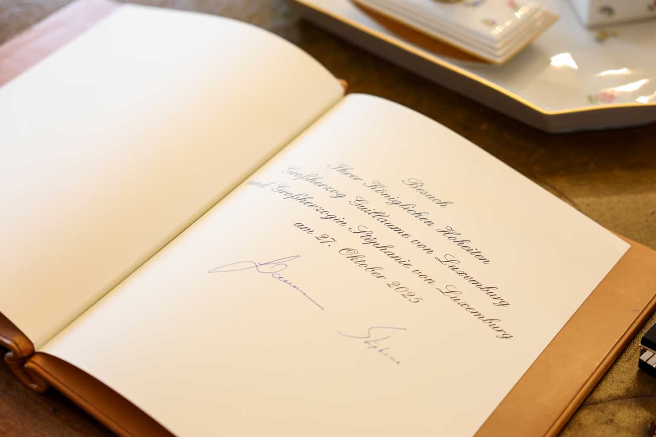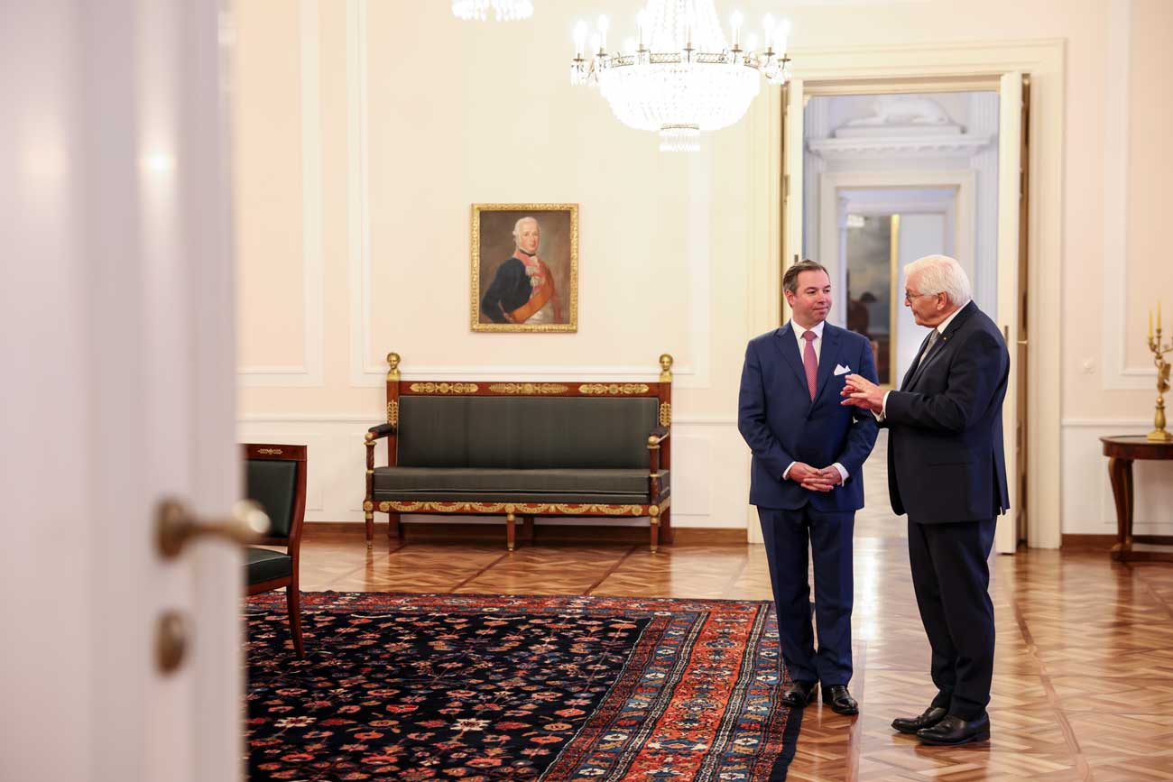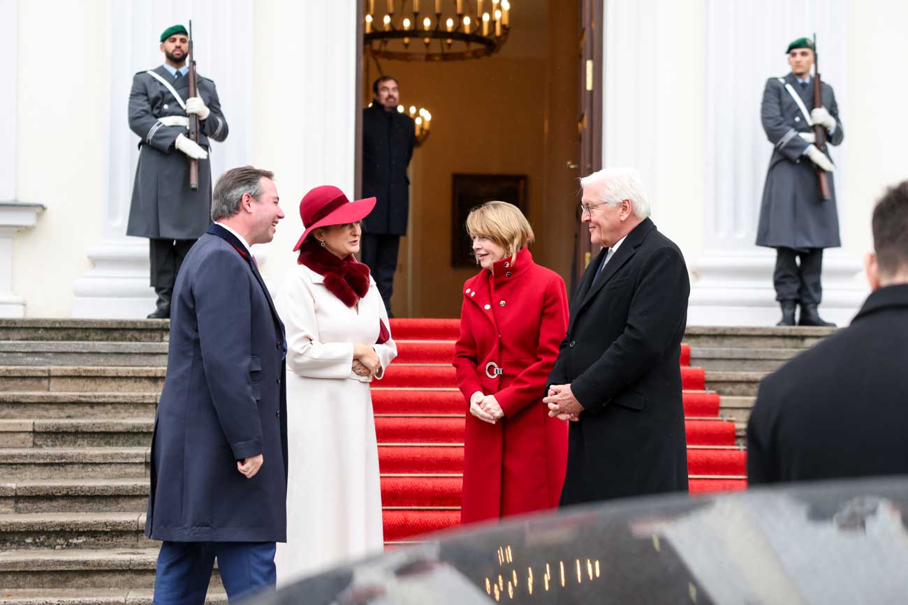 Le grand-duc Guillaume et la grande-duchesse Stéphanie ont été accueillis sur le tapis rouge déployé devant le château de Bellevue, la résidence officielle des présidents allemands. Elke Büdenbender, l’épouse du président allemand, était également présente pour accueillir leurs invités luxembourgeois. Le grand-duc Guillaume a passé en revue les troupes puis le couple présidentiel et le couple grand-ducal ont écouté les deux hymnes nationaux. Ils ont ensuite rejoint l’intérieur du palais pour signer le livre d’honneur.