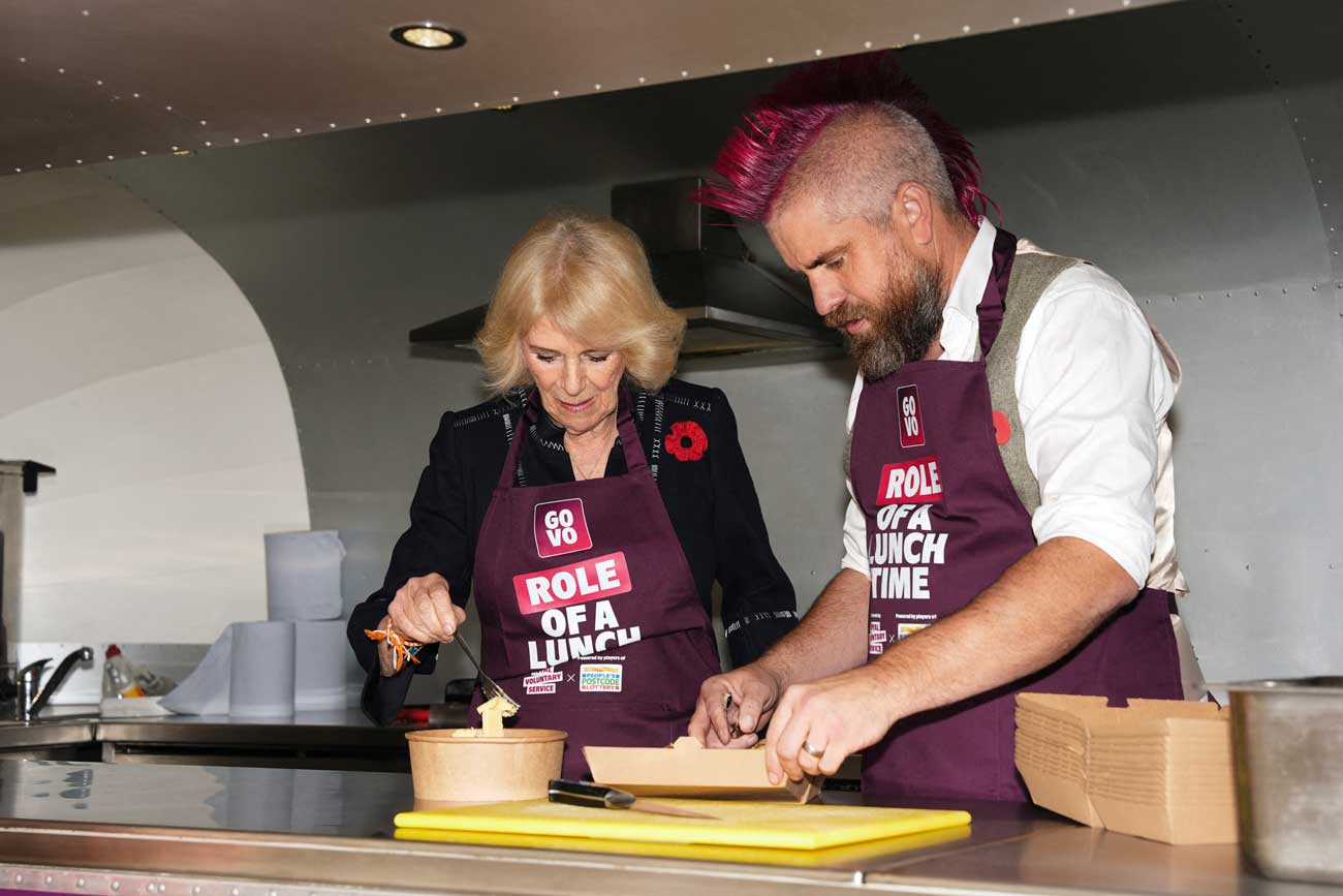 La reine Camilla a organisé un événement dans le jardin de son domicile londonien. À Clarence House, un food-truck livrait des pommes de terre avec l’aide de la Reine, à l’occasion de la Semaine des repas à domicile. Cet événement mettait en avant le travail des bénévoles d’associations qui viennent en aide aux personnes âgées ou vulnérables.