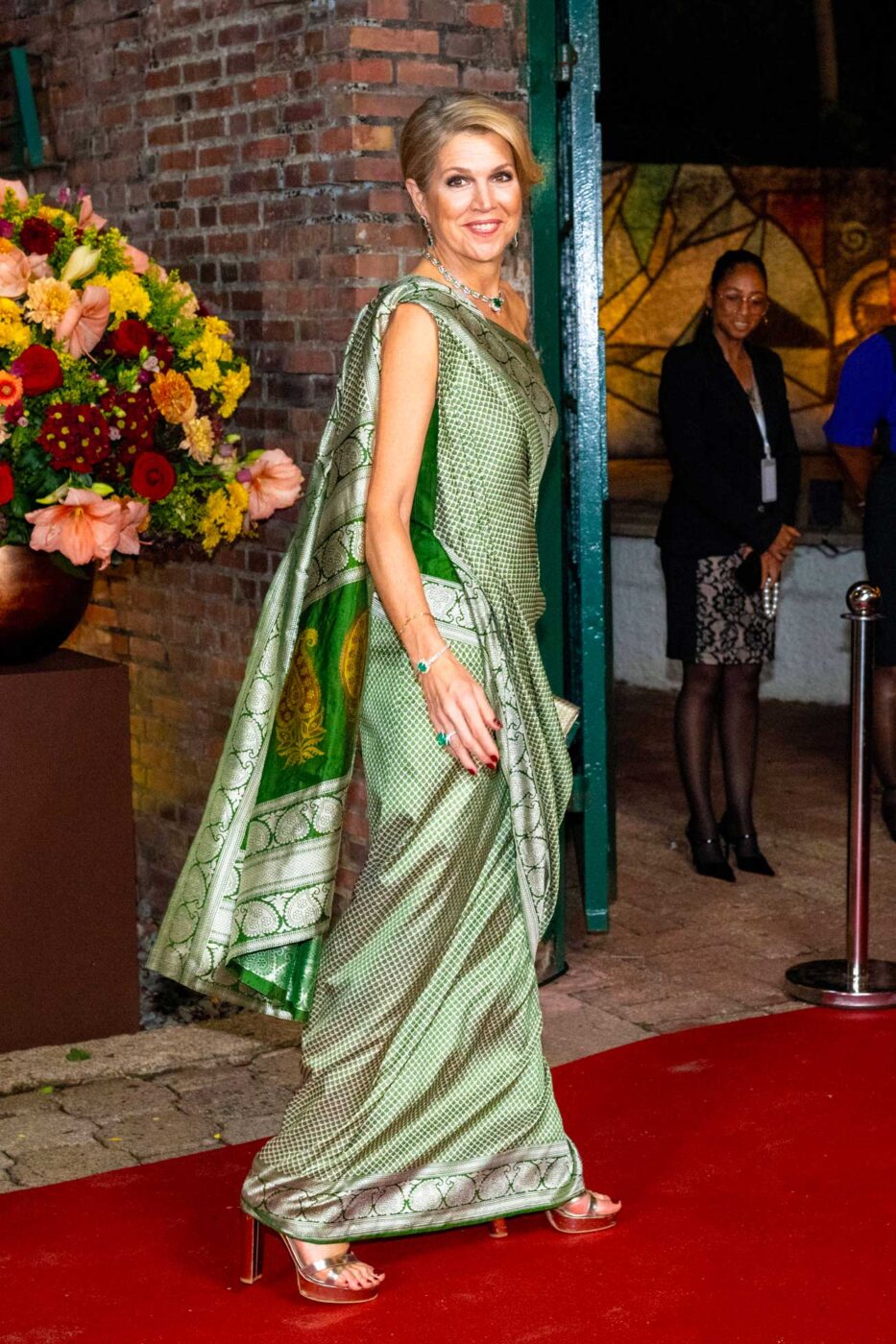 « J’ai sélectionné ce tissu de grande qualité, d’une couleur qui s’harmonisait parfaitement avec les bijoux qu’elle avait choisis », expliquait le couturier. Ce mardi, la reine Máxima portait à nouveau des bijoux sertis d’émeraudes assortis à son sari vert et argenté. « Le vert est une couleur que nous affectionnons toutes les deux ». Le collier et les boucles d’oreilles portés par la reine Máxima font partie d’une parure qui comprend aussi un diadème.