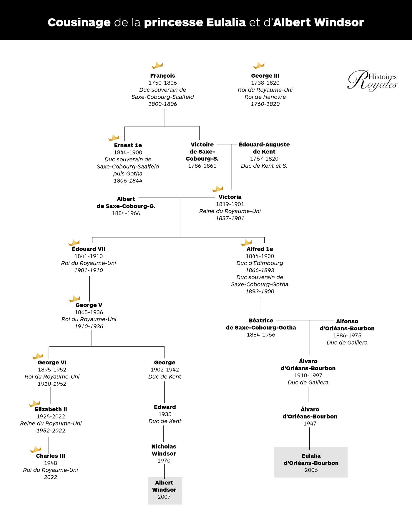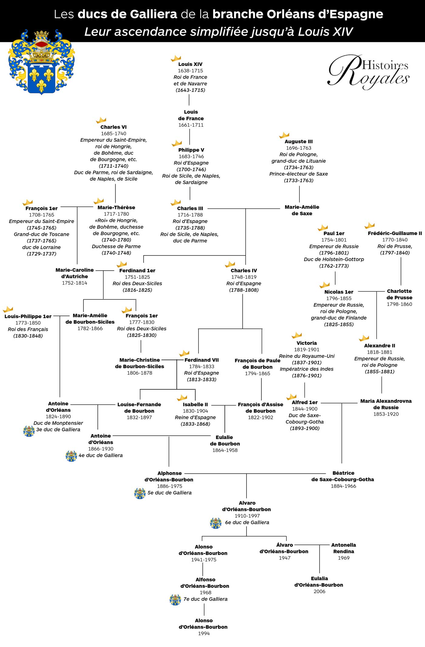 La princesse Eulalia est la petite-fille du défunt 6e duc de Galliera et la cousine germaine de l’actuel 7e duc de Galliera. Le titre de duc de Galliera est un titre ni français ni espagnol mais italien, créé durant la période napoléonienne. En 1812, alors roi d’Italie, Napoléon crée le duché de Galliera pour Joséphine de Leuchtenberg, fille du prince Eugène de Beauharnais. Joséphine deviendra reine de Suède en épousant le roi Oscar 1er. En 1837, après d’âpres négociations, le roi Oscar se sépare du duché et de ses propriétés, qui seront achetés par le marquis Raffaele de Ferrari. L’octroi du titre au marquis sera confirmé par le pape Grégoire XVI. Quelques années plus tard, Charles-Albert de Savoie, roi de Sardaigne, confirme sa reconnaissance du titre. Au décès du duc, sans héritier pour reprendre la succession, la duchesse douairière, fervente orléaniste, léguera en 1877 ses propriétés italiennes au prince Antoine d’Orléans, duc de Montpensier, le dernier fils de Louis-Philippe 1er, l’ancien roi des Français. En 1888, au décès de la duchesse douairière de Galleria, le roi Humbert 1er d’Italie reconnaît la succession du titre de duc de Galliera à Antoine d’Orléans.