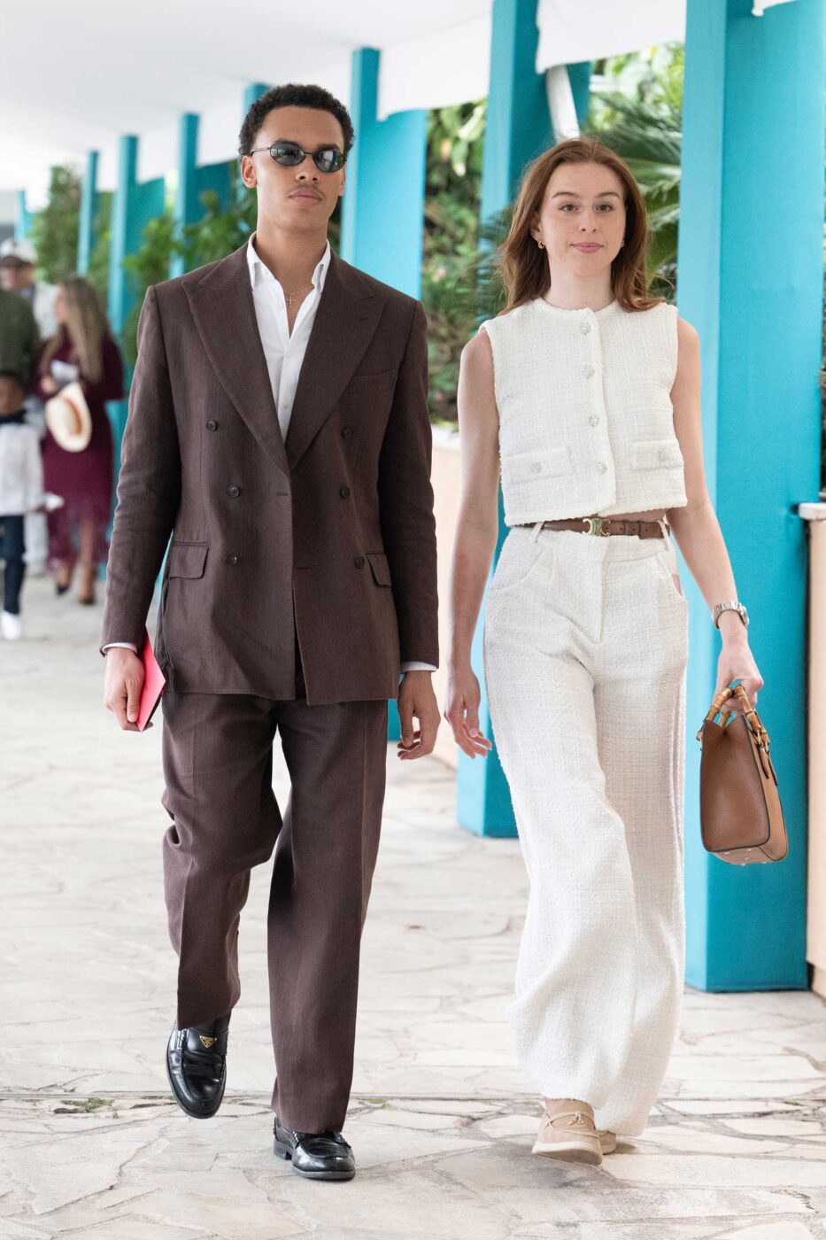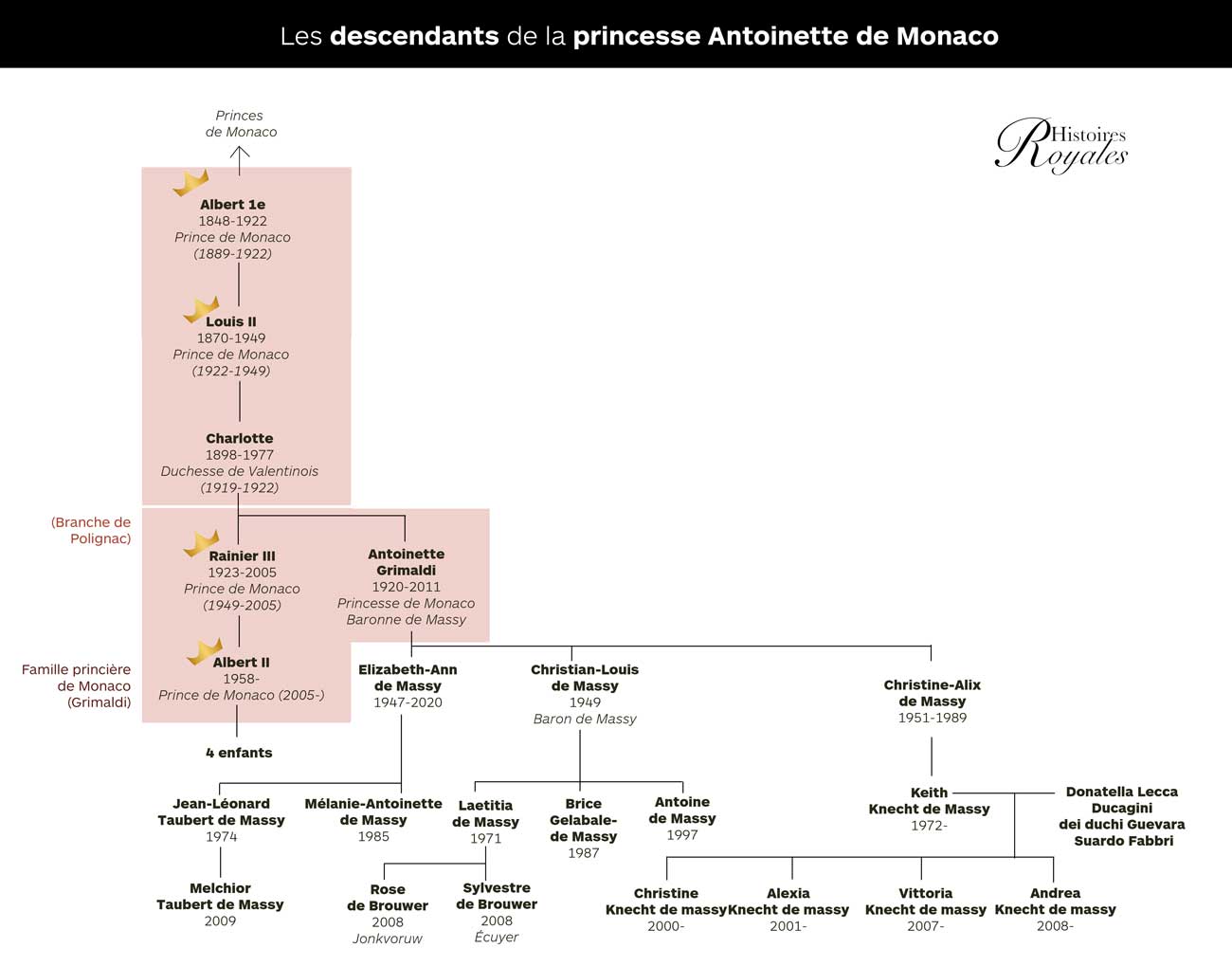 Alexandre Grimaldi n’était pas assis dans la tribune princière au côté de son père, le prince Albert II. Cette tribune était réservée aux membres de la famille figurant dans l’ordre de succession au trône. Alexandre est arrivé avec sa cousine, Christine Knecht de Massy, arrière-petite-fille de la princesse Antoinette, elle-même sœur du prince Rainier III. Christine est la petite-fille de Christine-Alix de Massy, fille de la princesse Antoinette et cousine germaine du prince Albert II, décédée à 38 ans. Alexandre et Christine ont pour ancêtres communs les plus proches la princesse Antoinette et le prince Pierre de Monaco.