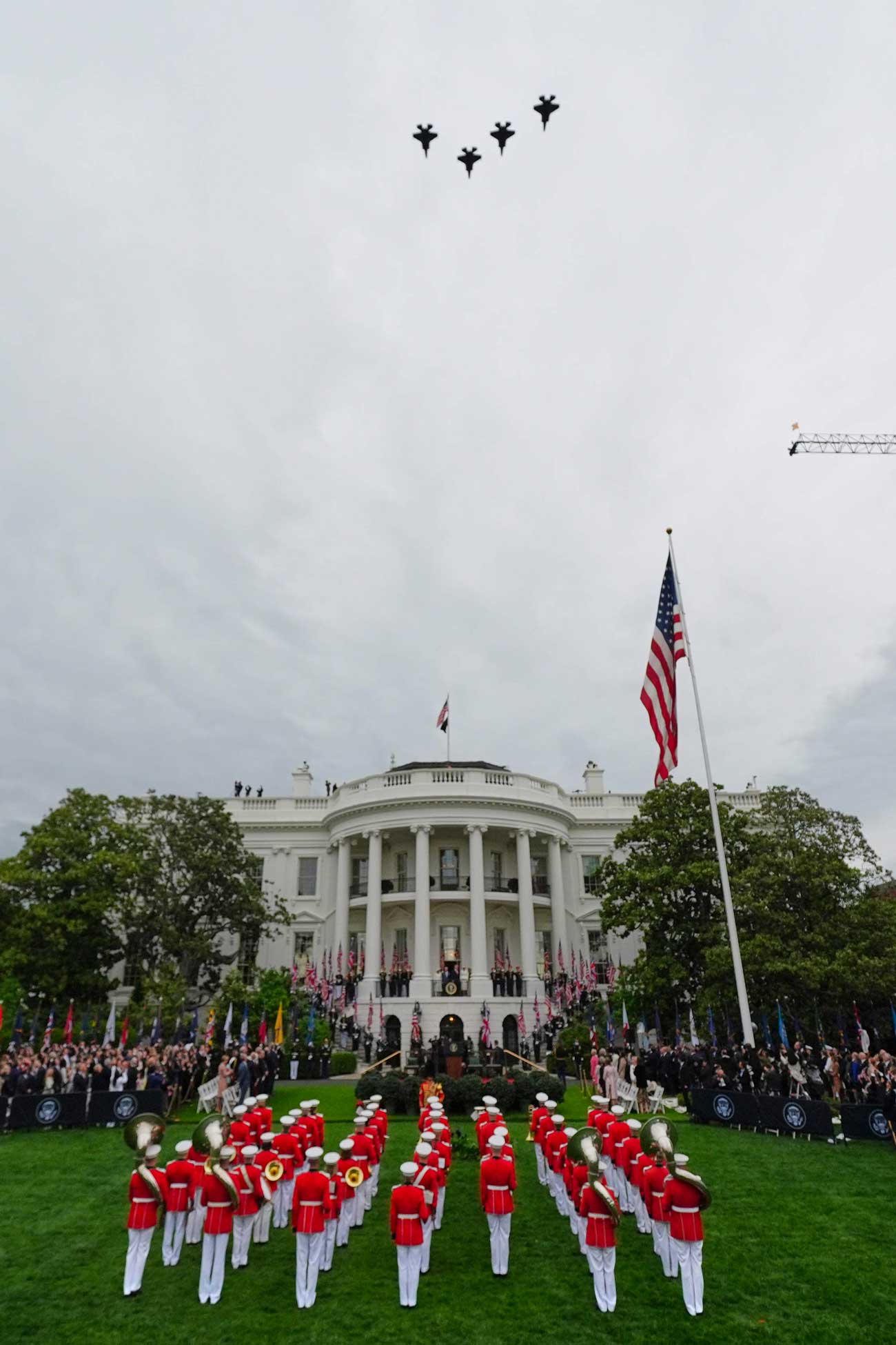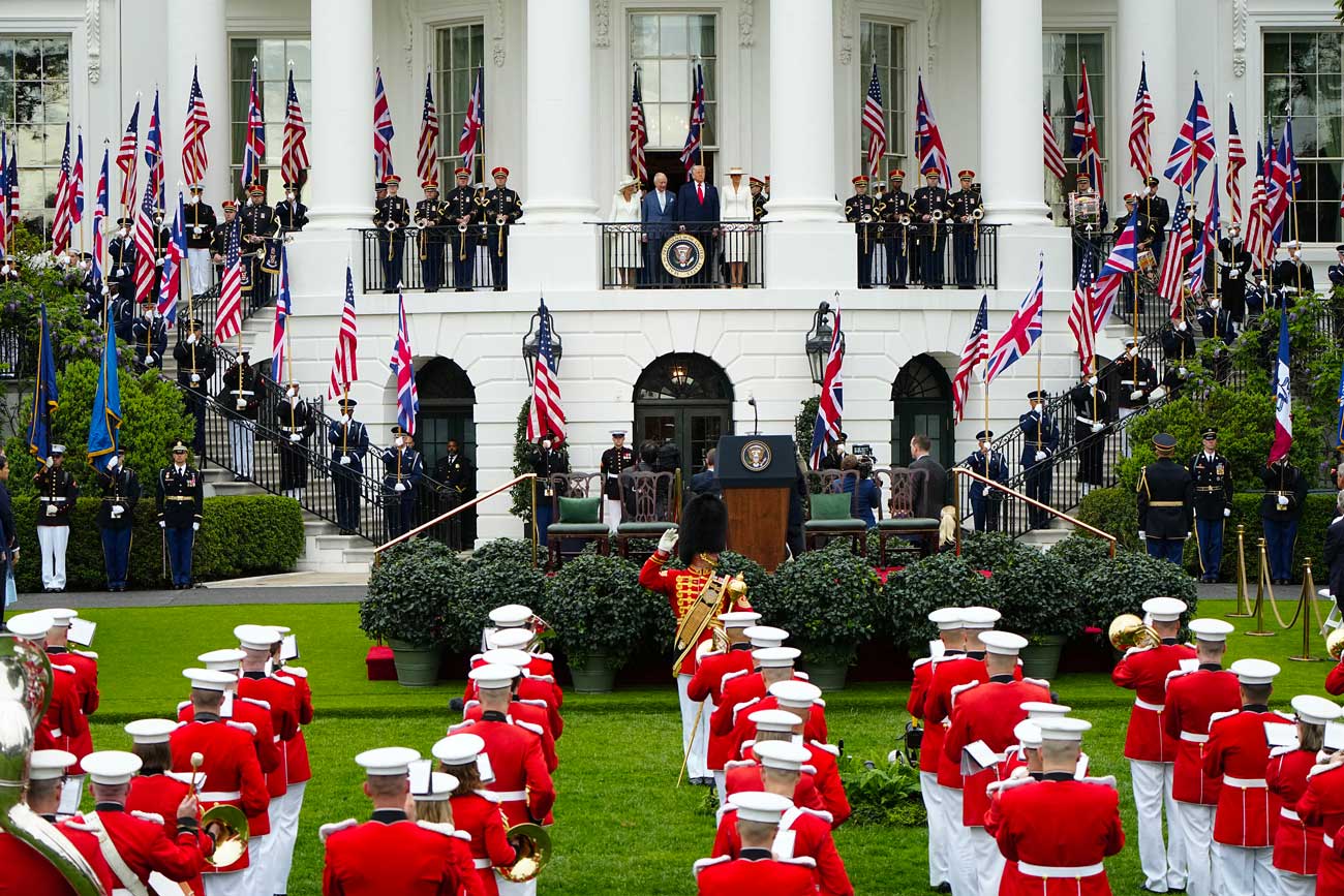 Donald Trump, 79 ans, et Melania Trump, 56 ans, avaient organisé une cérémonie d’État, à laquelle ont assisté plusieurs milliers d’invités, inspirée d’un rituel du 18e siècle, époque de la création des États-Unis. Accueil au son des trompettes de héraut, musiques militaires interprétées par la fanfare des Marines, sans oublier les joueurs de fifre et de tambours, tout était pensé pour réserver un accueil digne de ce nom au chef de l’État dont les Treize Colonies se sont séparées il y a maintenant deux siècles et demi. La visite d’État s’inscrit dans le cadre du 250e anniversaire de l’indépendance des États-Unis. Le 4 juillet 1776, les Treize Colonies ont pris leur indépendance vis-à-vis de la Grande-Bretagne.