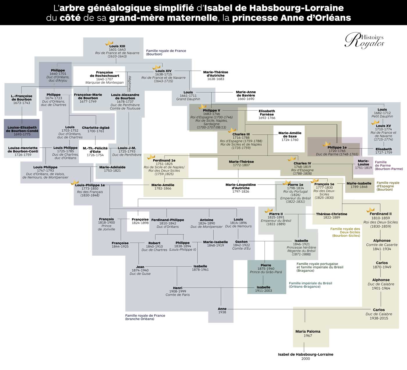 Ce mariage intéresse aussi le public français en raison de la grand-mère de la mariée, la princesse Anne de France. La princesse Anne, de la branche d’Orléans, est la tante du comte de Paris, l’actuel chef de la famille royale de France. L’archiduchesse Isabel est donc aussi une descendante du roi Louis-Philippe 1er des Français. Par ses ancêtres ducs de Parme, rois d’Espagne et rois des Deux-Siciles, la future mariée descend bien entendu de Louis XIV et de la dynastie des Bourbon.