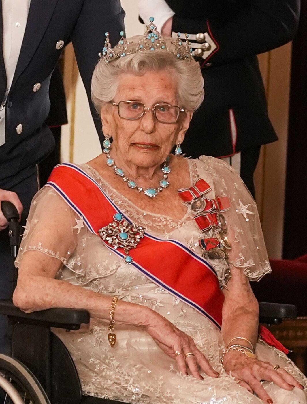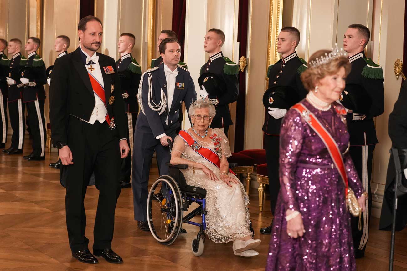 La princesse Astrid, qui fêtera ses 94 ans dans quelques jours, assiste toujours aux galas et aux grands événements protocolaires. La princesse Astrid se déplace uniquement en fauteuil roulant depuis plusieurs années. Le prince héritier Haakon est arrivé au palais à côté de sa tante ce 29 janvier. La princesse Astrid dipose d’une collection de diadème assez originaux par leurs formes ou leurs pierres. Ce jeudi, la princesse Astrid a choisi de porter son diadème de turquoises et l’ensemble des bijoux qui composent la parure complète.