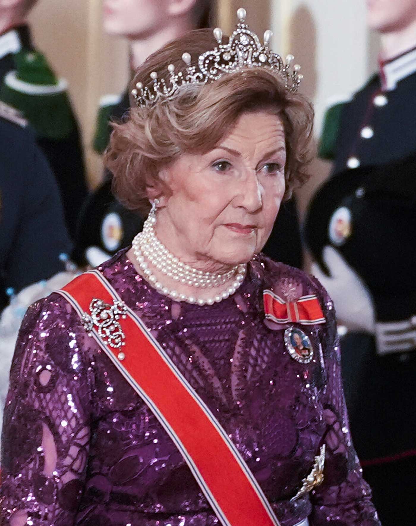 La reine Sonja porte plusieurs colliers de perles, une broche en diamants et perles, le ruban de l’ordre de Saint-Olaf et la médaille de l’ordre de la famille royale du roi Harald V (Photo : NTB/Dana Press)