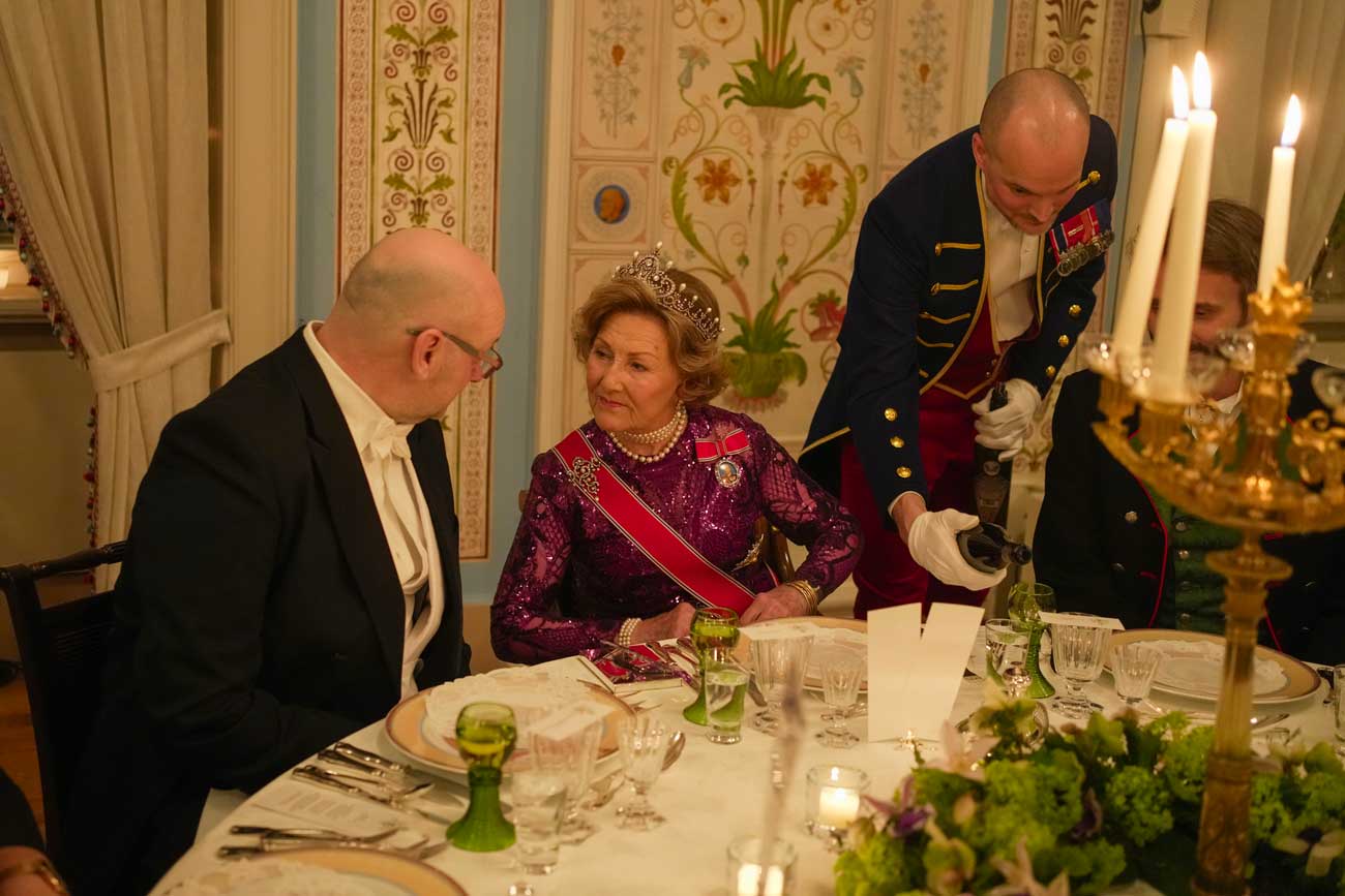 Lors de ce gala, les membres de la famille royale saluent les ambassadeurs et les accueillent au palais royal, puis les invités rejoignent la salle du banquet. Comme pour tous les galas, cette soirée est aussi l’occasion pour la reine et les princesses de porter un diadème. La reine Sonja portait le diadème de perles et diamants de la reine Maud. Ce diadème est un cadeau que le prince et la princesse de Galles ont offert à leur fille, la princesse Maud, à l’occasion de son mariage avec le prince Carl de Danemark, en 1896. En novembre 1905, le prince Carl est élu par le parlement norvégien pour devenir le nouveau roi de Norvège. Carl prendra le nom de règne de Haakon VII et part s’installer dans son nouveau pays avec son épouse, la reine Maud.