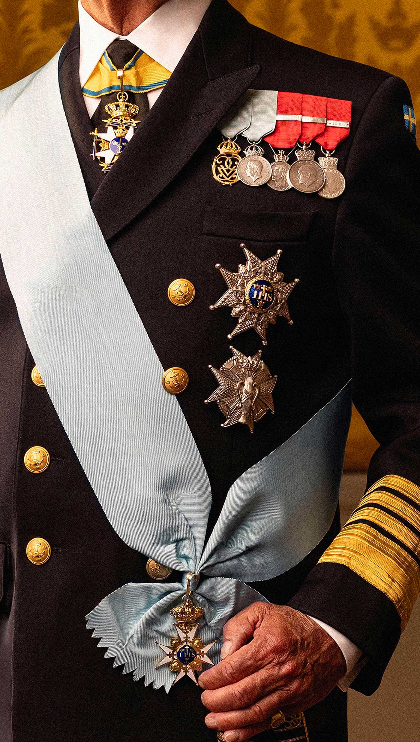Der König trägt eine Reihe von Orden, darunter die Gedenkmedaille zum 90. Geburtstag von König Gustav V. (1948), die Gedenkmedaille zum 85. Geburtstag von König Gustav VI. Adolf (1967), die Gedenkmedaille zum 100. Geburtstag von König Haakon VII. von Norwegen (1972), die Jubiläumsmedaille von König Olav V. von Norwegen anlässlich seines 25-jährigen Regierungsjubiläums (1982) und die Jubiläumsmedaille von König Harald V. von Norwegen anlässlich seines 25-jährigen Regierungsjubiläums (2016).