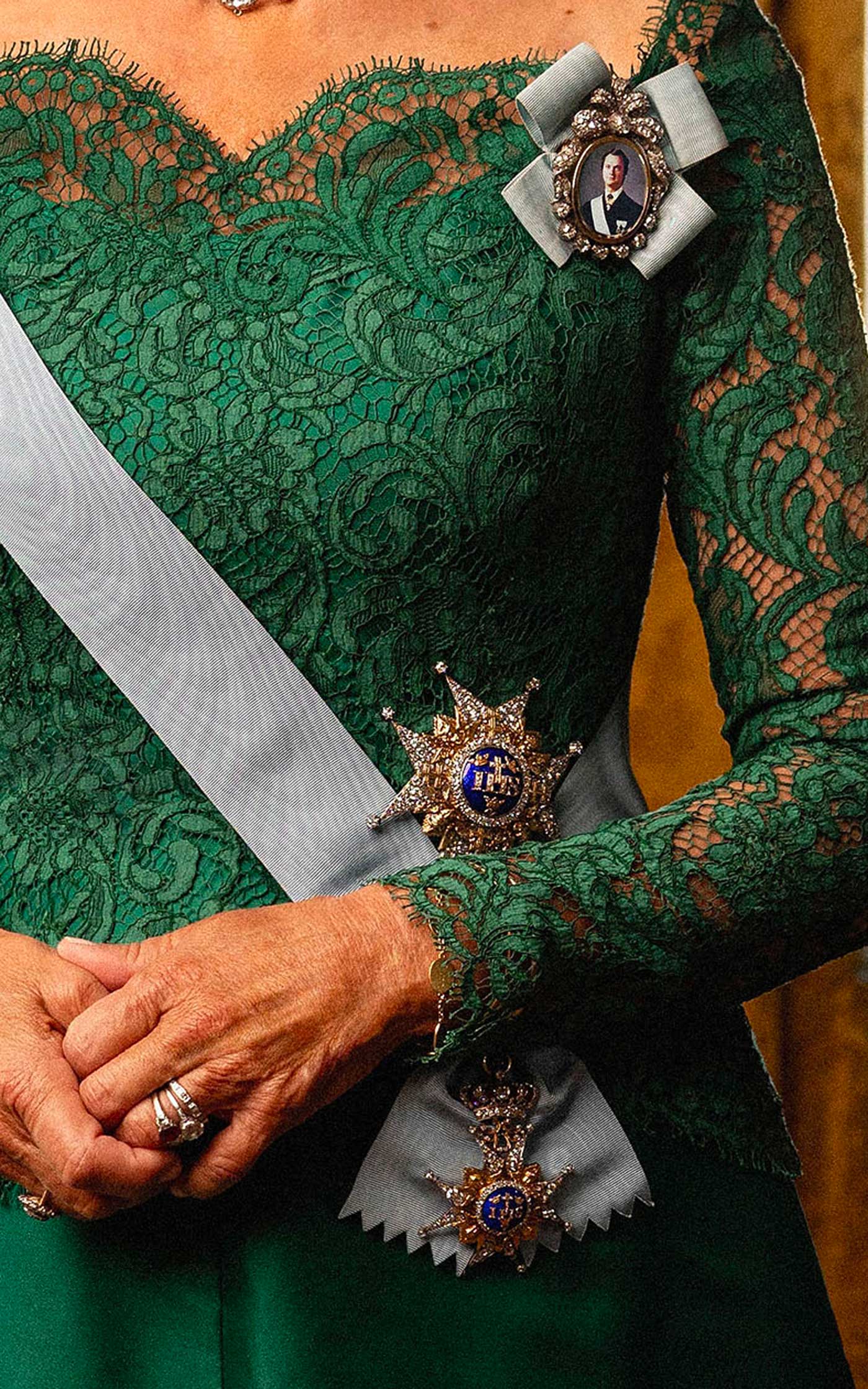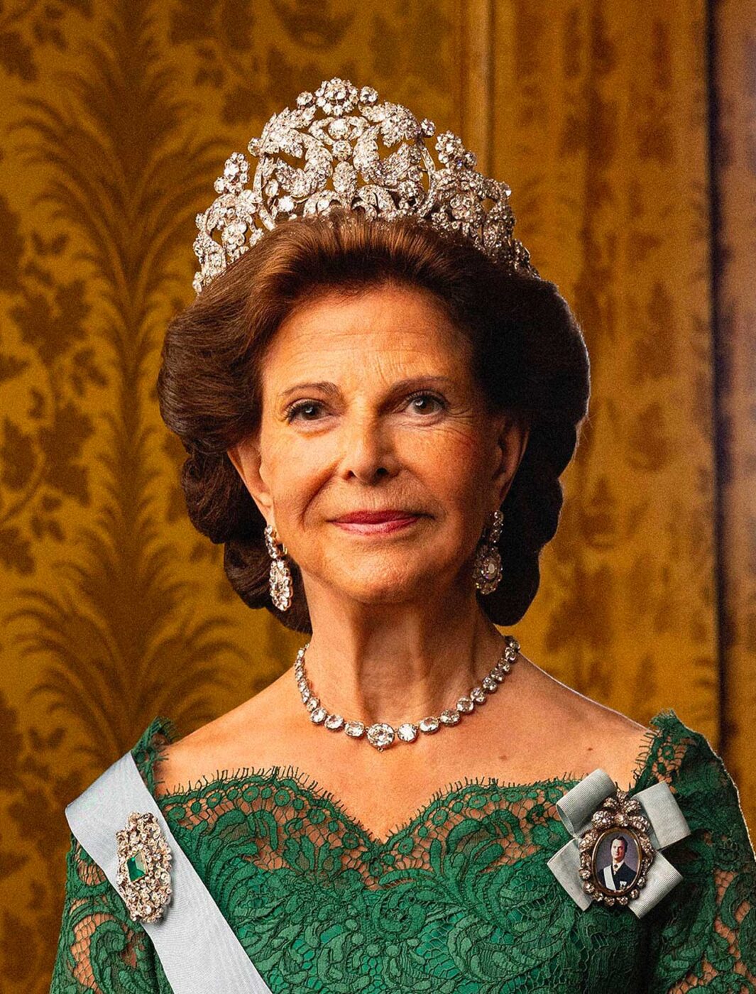 Königin Silvia trägt das blaue Band des Seraphinenordens als Schulterband und dessen mit Diamanten besetzte Sternplakette. Außerdem trägt sie das Miniaturporträt ihres Mannes an einer blauen Schleife, dem Abzeichen des Ordens der Familie von König Carl XVI. Gustaf, einem Orden, der den Frauen der Königsfamilie vorbehalten ist. Königin Silvia trägt das prestigeträchtige brasilianische Diadem, eines der imposantesten Diademe der Königsfamilie. Seine brasilianische Herkunft ist für Königin Silvia, deren Vater Deutscher und deren Mutter Brasilianerin ist, ebenfalls symbolträchtig. Silvia verbrachte einen Teil ihrer Kindheit in Brasilien.