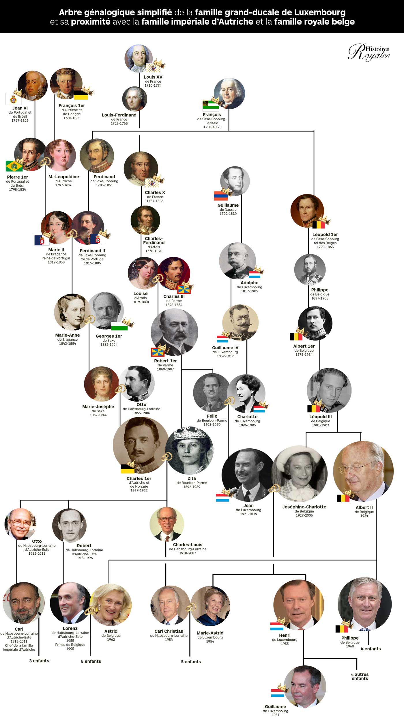 Vereinfachter Stammbaum, der die Verwandtschaft und die gemeinsamen Vorfahren der großherzoglichen Familie und der kaiserlichen Familie Österreichs hervorhebt. Der Stammbaum zeigt auch Erzherzog Karl, das derzeitige Oberhaupt der kaiserlichen Familie, und den Zweig von Erzherzog Lorenz, der mit der belgischen Königsfamilie verbunden ist. Der Zweig von Christian von Österreich und der Zweig von Lorenz von Österreich wurden in den belgischen Adel aufgenommen (Bild: Histoires Royales)