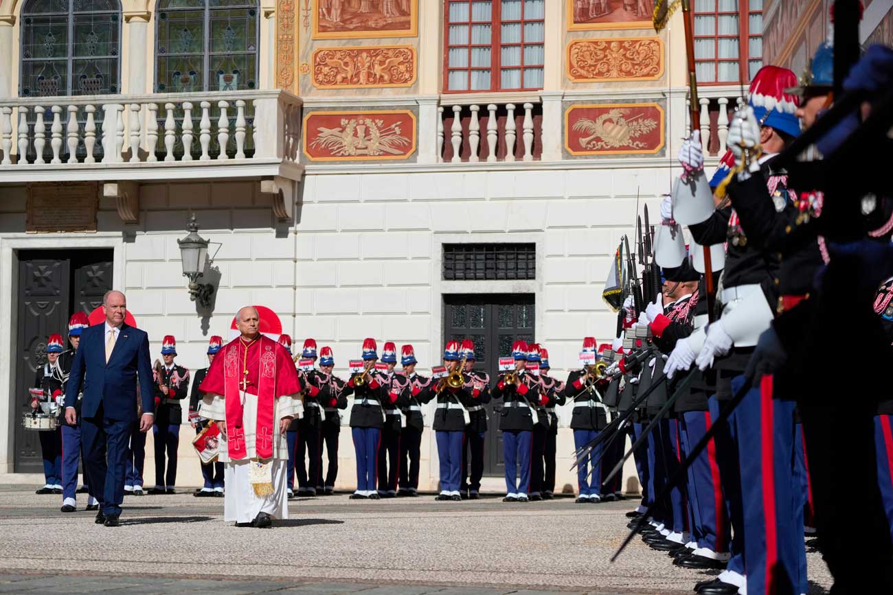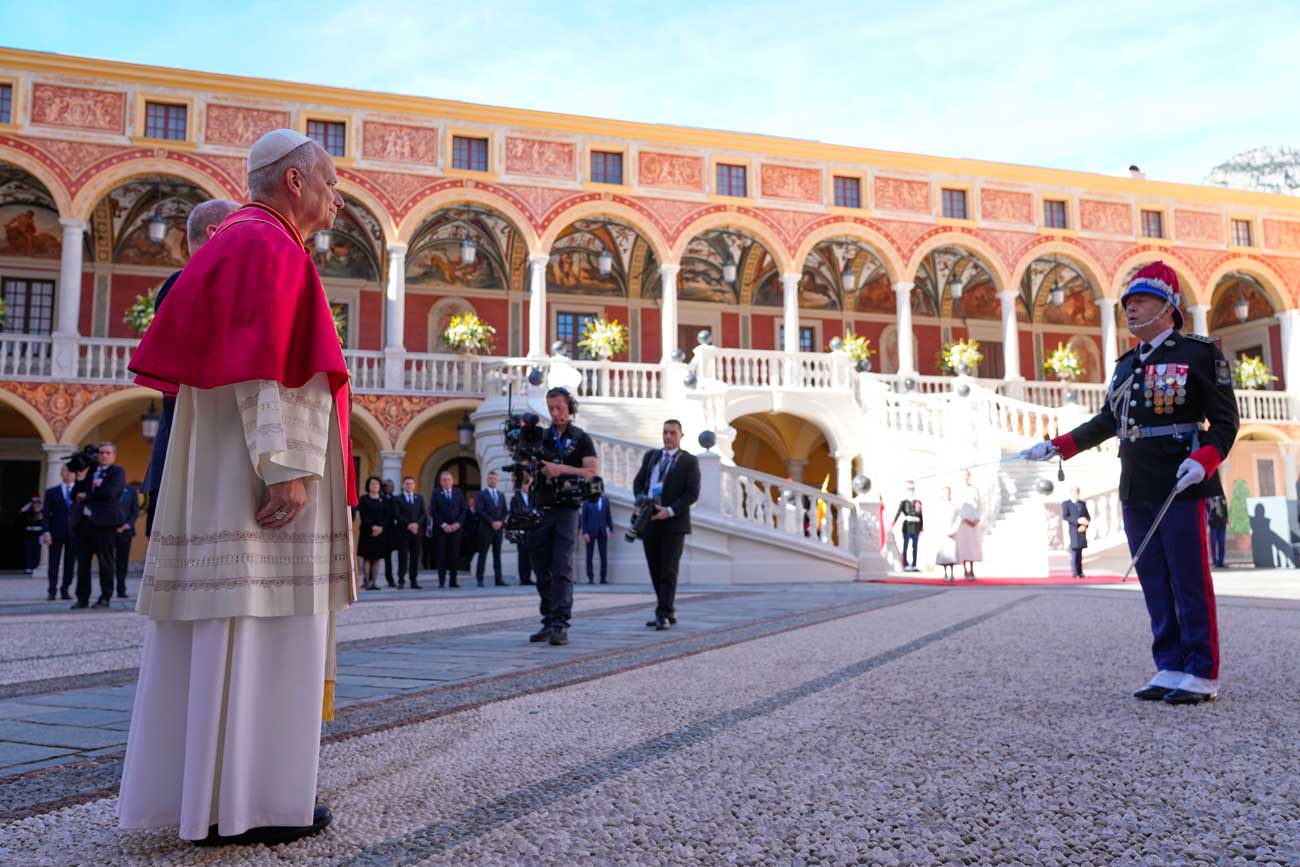 Fürst Albert II. und Fürstin Charlène empfingen das Oberhaupt der katholischen Kirche beim Aussteigen aus dem Hubschrauber auf dem Hubschrauberlandeplatz von Monaco in Anwesenheit der Sicherheitskräfte, vertreten durch die Carabinieri. Die monegassischen Herrscher waren umgeben von einer Delegation monegassischer Prälaten und Vertrauter des Papstes sowie von den höchsten Vertretern des Landes, darunter Staatsminister Christophe Mirmand. Bei seinem Aussteigen aus dem Hubschrauber wurde eine Salve Kanonenschüsse abgefeuert, und die Flagge des Vatikans wurde auf einem der Türme des Fürstenpalasts gehisst.