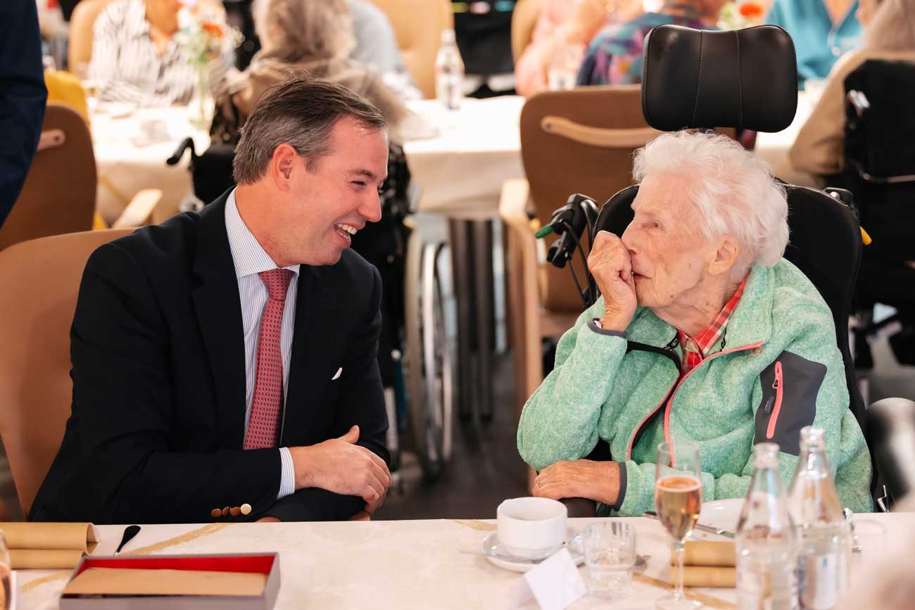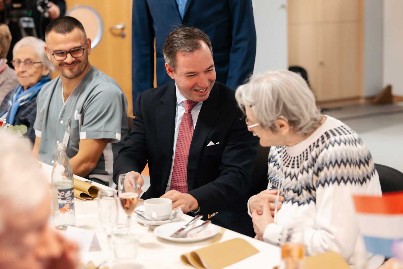 Großherzog Guillaume ist sich auch der Hingabe des Pflegepersonals bewusst, das selbst an Tagen arbeitet, an denen andere feiern, insbesondere hier im Rahmen der Feierlichkeiten zum Thronwechsel. Das Großherzogliche Haus betont, dass Großherzog Guillaume „denen, die der Gesellschaft unermüdlich dienen, selbst in Zeiten des Feierns“,