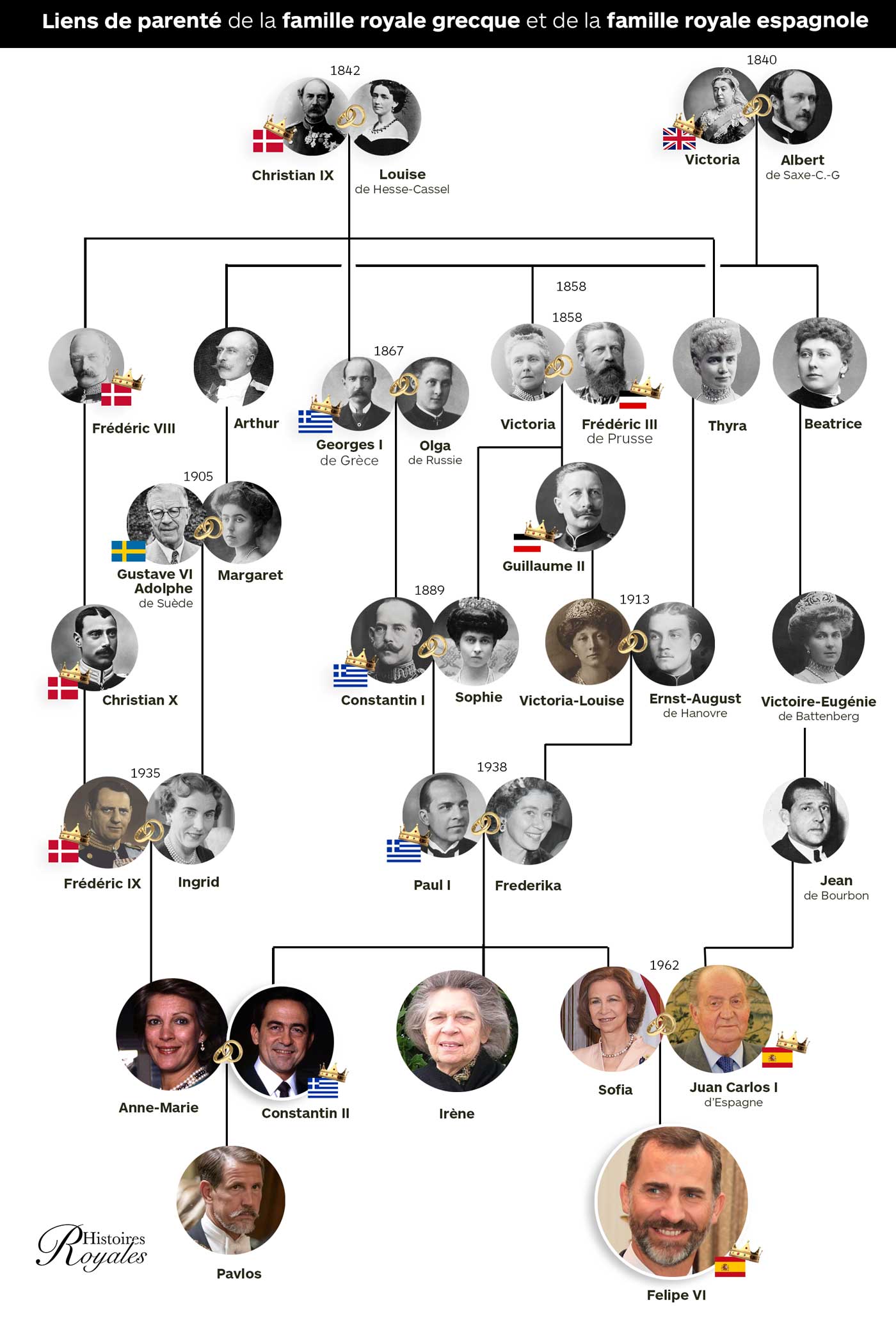Arbre simplifié indiquant les ancêtres en commun les plus proches entre la famille royale de Grèce et la famille royale d’Espagne (Image : Histoires Royales)