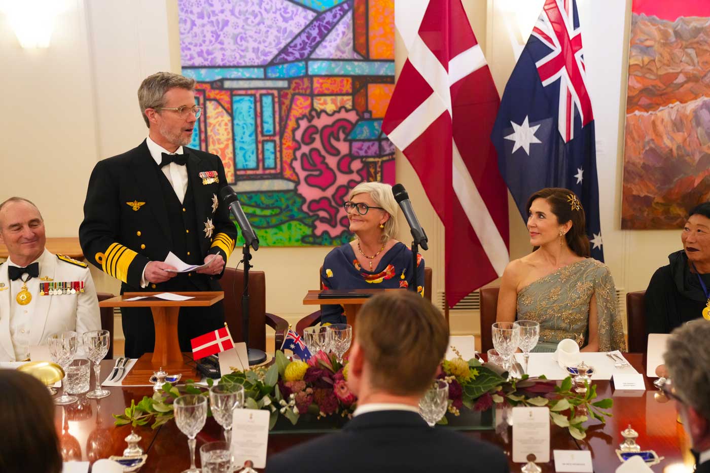 Le roi et la reine de Danemark ont été accueillis à Canberra par la gouverneure générale d’Australie, Sam Mostyn, qui représente le roi Charles III dans son royaume austral. En soirée, la gouverneure générale avait organisé un banquet d’État en l’honneur de ses invités, à la Government House de Canberra. Comme le veut la tradition, les banquets d’État s’ouvrent toujours par le discours du chef d’État hôte ou son représentant, suivi d’un discours du chef d’État invité. Lorsque le roi Frederik a pris la parole, il en a profité pour faire l’éloge de son épouse, en se remémorant des souvenirs de leurs premiers instants ensemble, qu’ils ont vécus en Australie.