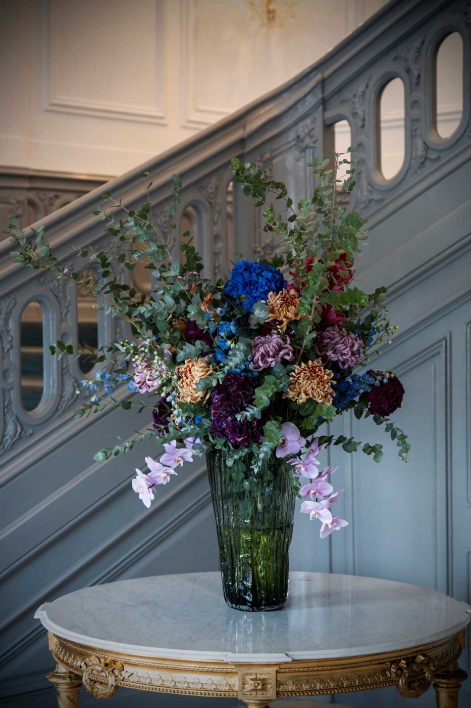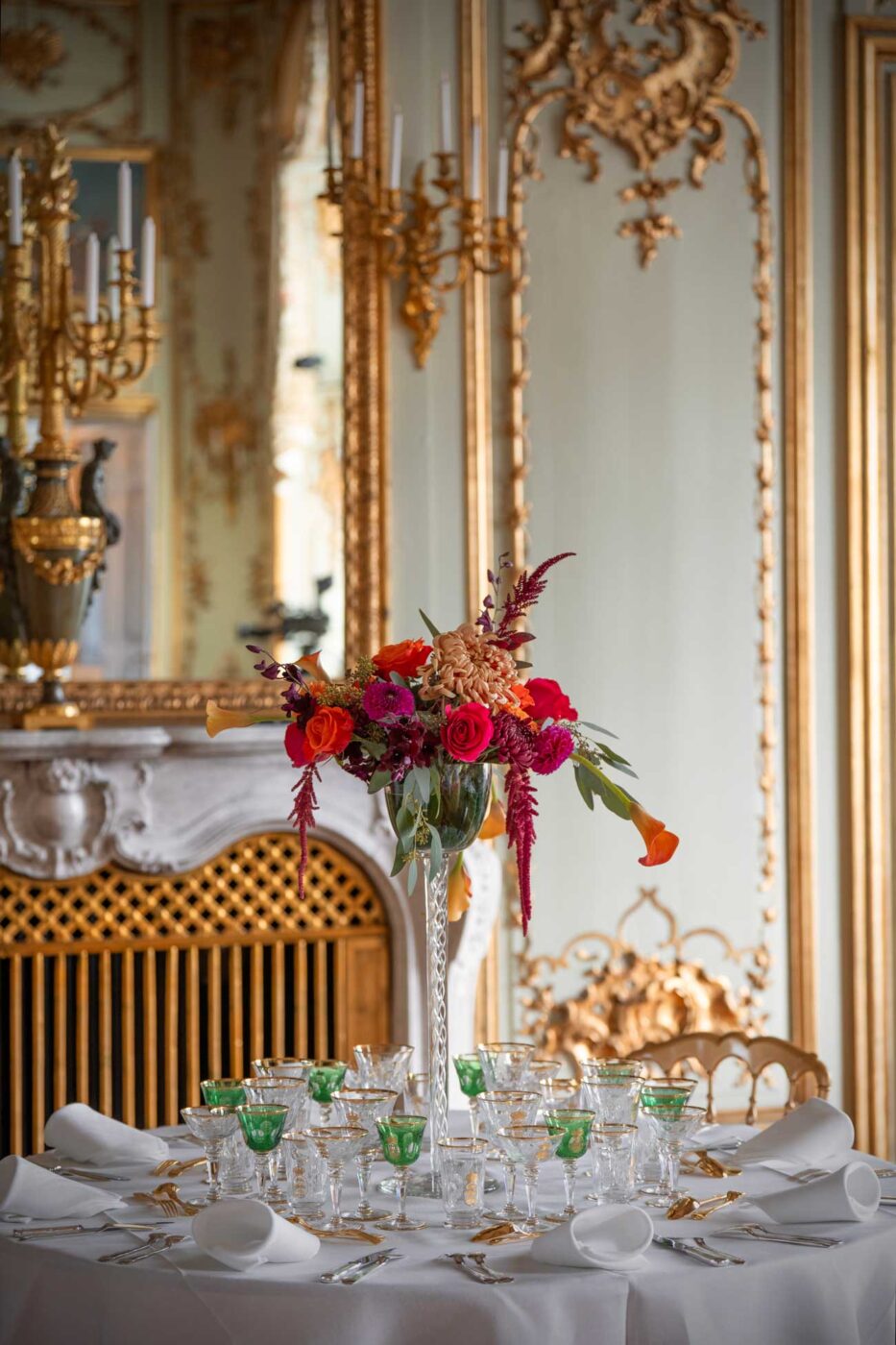 La Maison royale précise que la reine Mary a elle-même participé au choix des fleurs qui décoraient les tables dressées dans la salle des chevaliers du palais Christian VII. Les bouquets étaient composés de fleurs automnales, dont certaines, comme l’amarante, ont été cueillies dans les jardins du palais de Fredensborg. Certaines fleurs rose vif ou orange vif avaient été choisies par la reine pour apporter des touches de couleur en accord avec les dorures de la pièce. Dahlias, roses, callas, hortensias, chrysanthèmes, orchidées, violette et eucalyptus composaient les bouquets présentés dans des vases en verre avec un pied en spirale des années 1920.