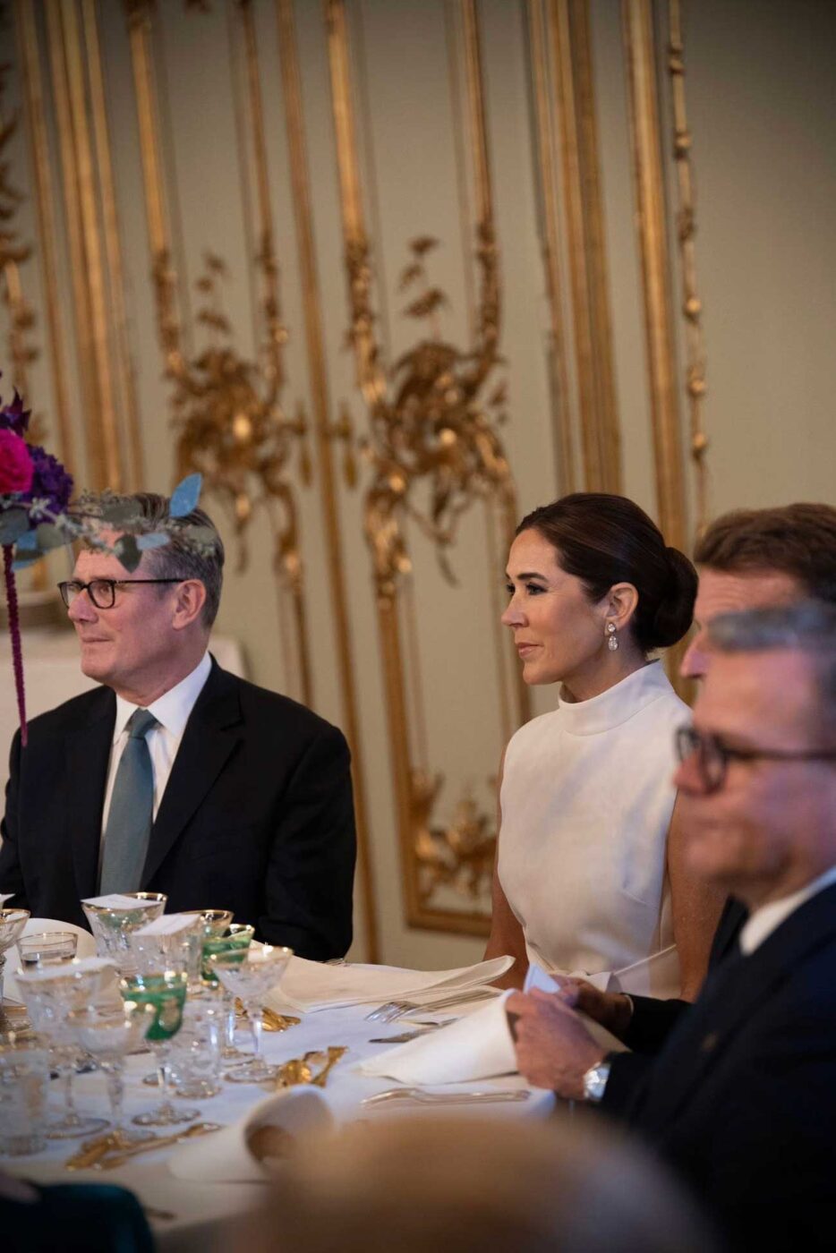 La reine Mary assise à table entre le premier ministre britannique Sir Keir Starmer et le président français Emmanuel Macron (Photo : Kongehuset)