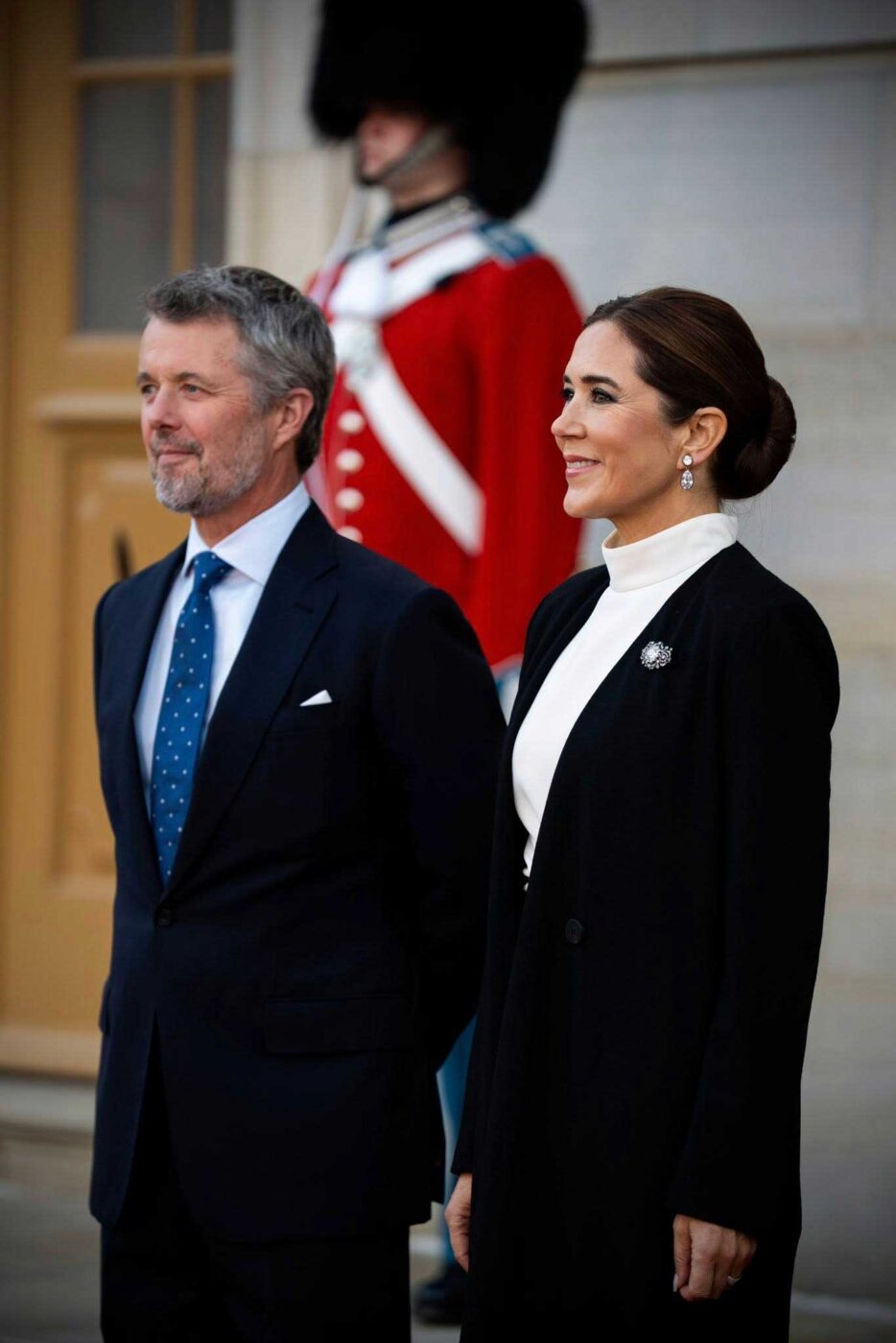 Le roi Frederik X et la reine Mary de Danemark attendent leurs invités devant l’entrée du palais Christian VII ce 1er octobre 2025 (Photo : Kongehuset)