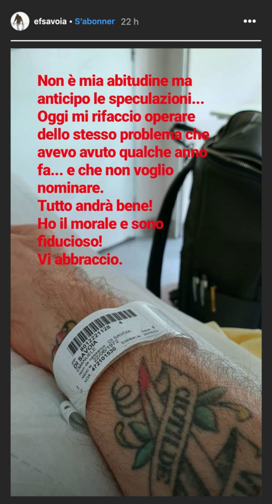 Emmanuel-Philibert de Savoie sait que sa visite à l’hôpital peut difficilement rester secrète. Alors, il a préféré anticiper, en publiant lui-même une photo sur Facebook et Instagram. Il n’a pas photographié son visage, montrant simplement son bras tatoué du nom de son épouse et de l’une de ses filles. Il a accompagné sa photo du message suivant : « Ce n’est pas dans mes habitudes, mais j’anticipe les spéculations… Je me fais réopérer aujourd’hui pour le même problème que j’ai connu il y a quelques années… et que je ne veux pas nommer. Tout va bien se passer ! Je suis confiant ! Je vous embrasse. » Nous lui souhaitons un prompt rétablissement et du courage pour son combat contre cette maladie.
