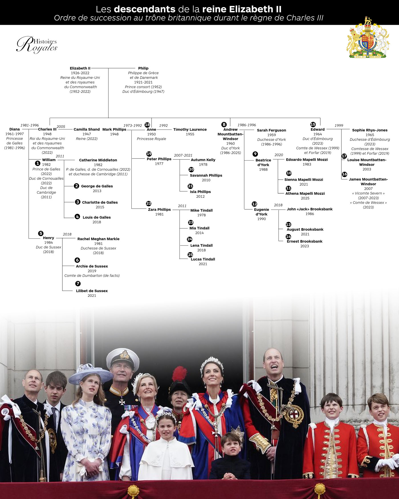 Le prince William occupe la première place dans l’ordre de succession, en tant qu’héritier direct du trône. Ses trois enfants, George, Charlotte et Louis, occupent les 2e, 3e et 4e places. Le prince Harry, deuxième fils du roi Charles III, est 5e dans l’ordre de succession et il est suivi par ses deux enfants, le prince Archie, 6e, et la princesse Lilibet, 7e. Le prince Andrew est 8e dans l’ordre de succession, bien que la princesse Anne soit son aînée. À l’époque de leur naissance, les garçons avaient la priorité sur les filles au sein d’une même fratrie, ce qui n’est plus le cas aujourd’hui depuis la révision de 2013. Cependant, cette révision ne s’applique pas de manière rétroactive.