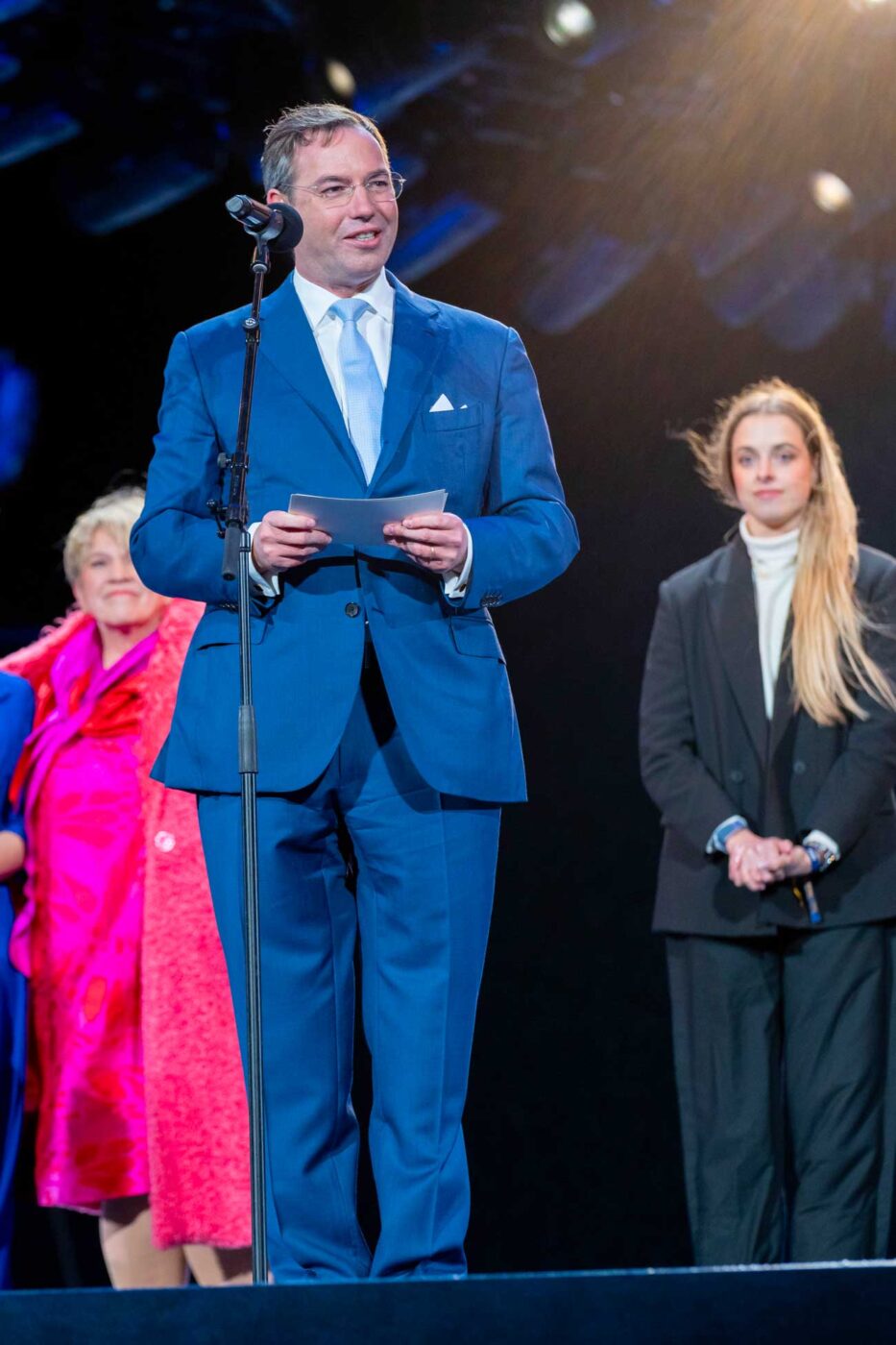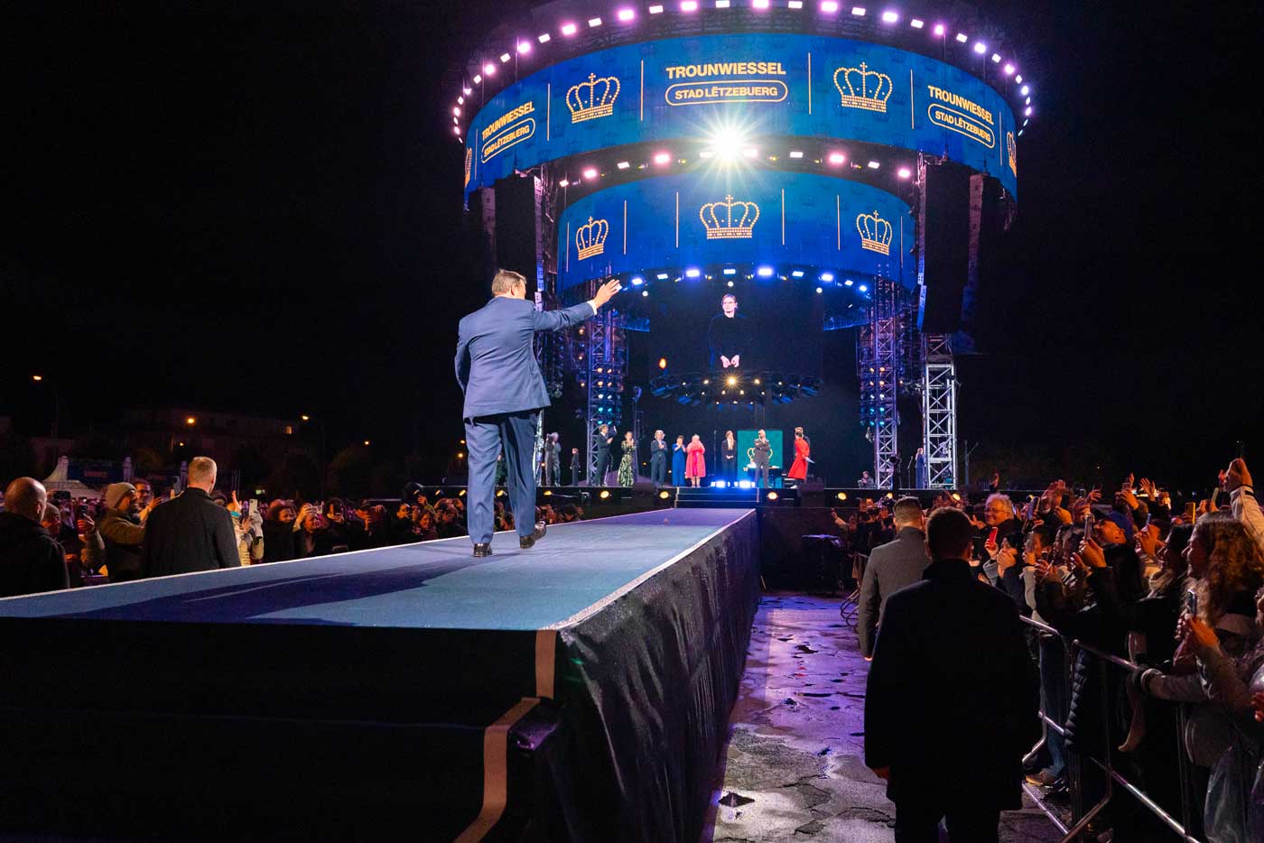 Le grand-duc Guillaume, qui concluait sa première journée complète en tant que chef de l’État luxembourgeois, est monté sur la scène. Le nouveau souverain a traversé le long podium qui reliait la tribune à la scène circulaire, où il a prononcé un bref discours de remerciement, sous les acclamations du public.