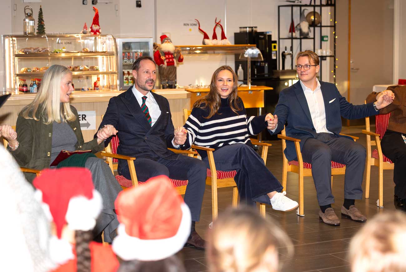 La princesse héritière Mette-Marit, le prince héritier Haakon, la princesse Ingrid Alexandra et le prince Sverre Magnus participent à une activité de chants de Noël avec les résidents (Photo : Andreas Fadum / Dana Press)