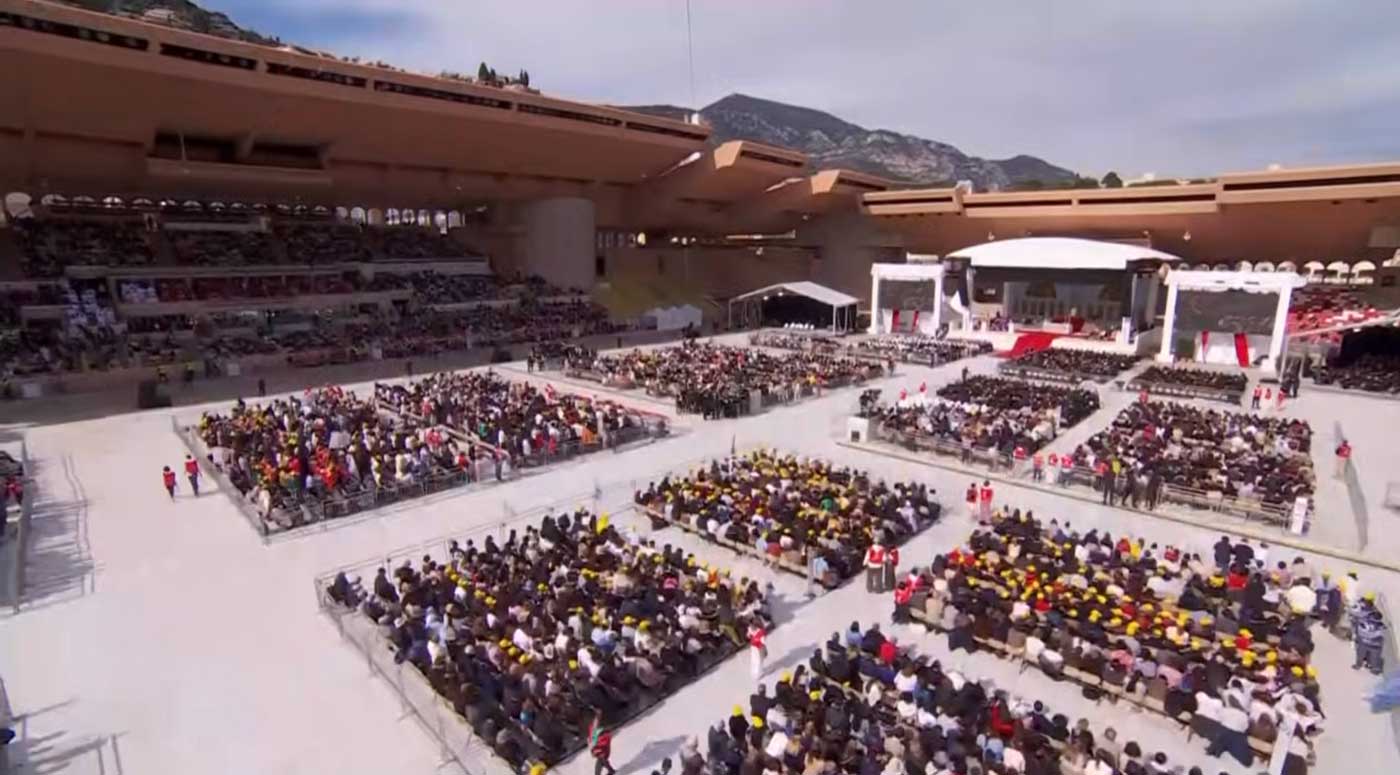 Le pape Léon XIV a aussi rencontré la communauté catholique de Monaco et les catéchumènes lors d’un événement organisé à l’église Sainte-Dévote. Au milieu de l’après-midi, le pape a célébré une messe au Stade Louis-II, devant 15 000 personnes, dont la famille princière. Le prince Albert II, la princesse Charlène, la princesse Caroline et la princesse Stéphanie étaient présents. Charlotte Casiraghi, Pierre Casiraghi et son épouse Beatrice, ainsi que Louis Ducruet et son épouse Marie ont assisté à la messe dans le stade.
