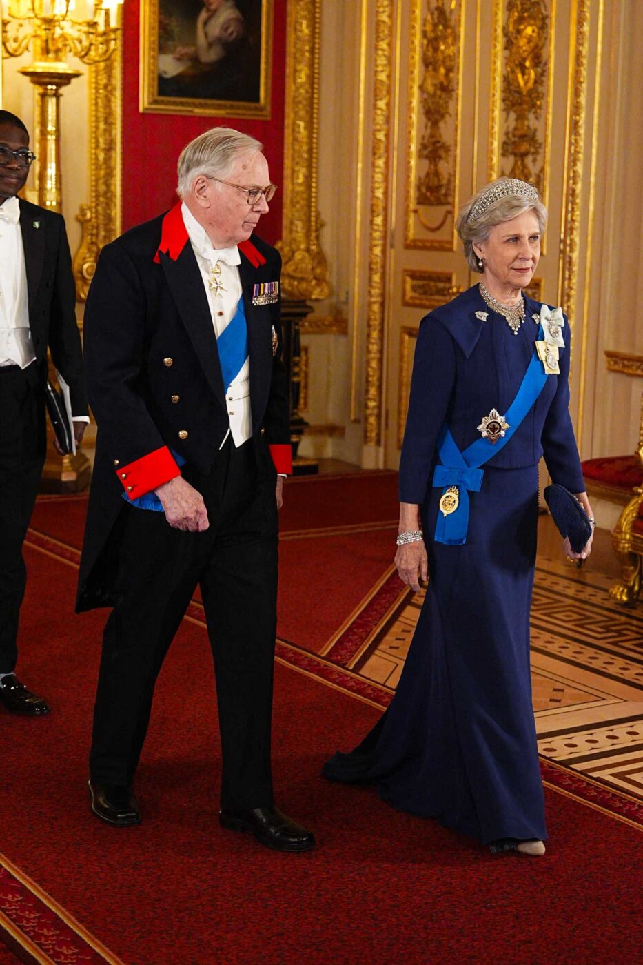 Le roi Charles III, le prince de Galles, le duc d’Édimbourg, le duc de Gloucester et Sir Timothy Laurence étaient les cinq membres masculins de la famille royale qui ont participé à ce dîner. Ils portaient l’ensemble de leur distinction, dont le ruban bleu de l’ordre de la Jarretière pour Charles et son fils aîné. Le frac porté par les hommes de la famille royale est en réalité l’uniforme de Windsor. L’uniforme de Windsor a été créé spécialement pour les monarques, les princes et certains hauts dignitaires participant à des galas à Windsor. L’uniforme présente un col et des revers des manches rouge écarlate. La première version de ce manteau a été introduite par George III en 1779.