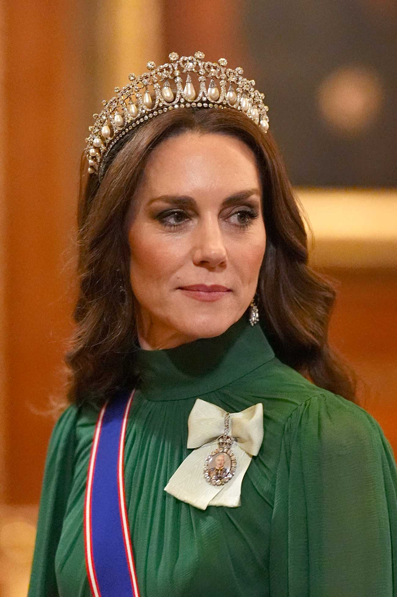 La princesse de Galles portait, sans surprise, son diadème fétiche. La princesse Catherine porte presque toujours ce diadème de perles, appelé le diadème aux nœuds d’amour ou encore, le diadème de Cambridge. L’épouse du prince William portait une robe de soirée couleur émeraude signée du créateur singapourien Andrew Gn. Kate portait des boucles d’oreilles dont elle a hérité de la reine Elizabeth II. Enfin, le ruban porté en écharpe par Catherine est bleu bordé des couleurs du drapeau britannique car elle est grand-croix de l’ordre de Victoria mais elle n’est pas membre de l’ordre de la Jarretière.