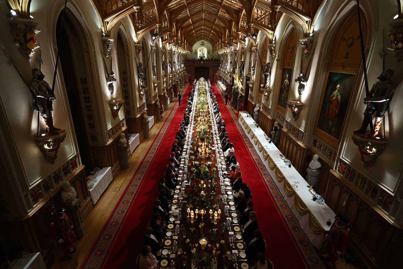 Les invités de ce banquet ont pris place autour d’une table de 47 mètres de long, dressée dans le hall St-George du château de Windsor et décorée de fleurs de saison provenant du domaine de Windsor et du jardin de Savill. Les bouquets et décorations florales comprenaient des narcisses, des tulipes, des hellébores, des jacinthes, des primevères, des mimosas et des iris.