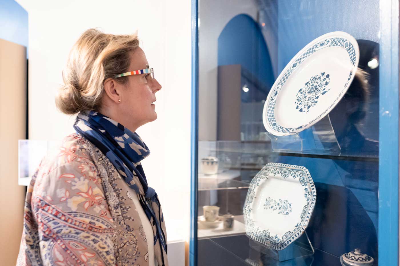 La comtesse de Paris observe de la vaisselle (Photo : David Nivière)