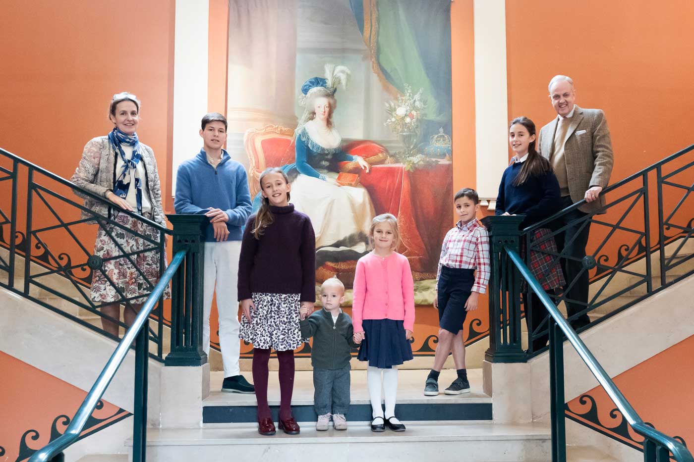 Le comte et la comtesse de Paris avec leurs six enfants, lors de leur visite de l’exposition au musée des Avelines à Saint-Cloud (Photo : David Nivière)