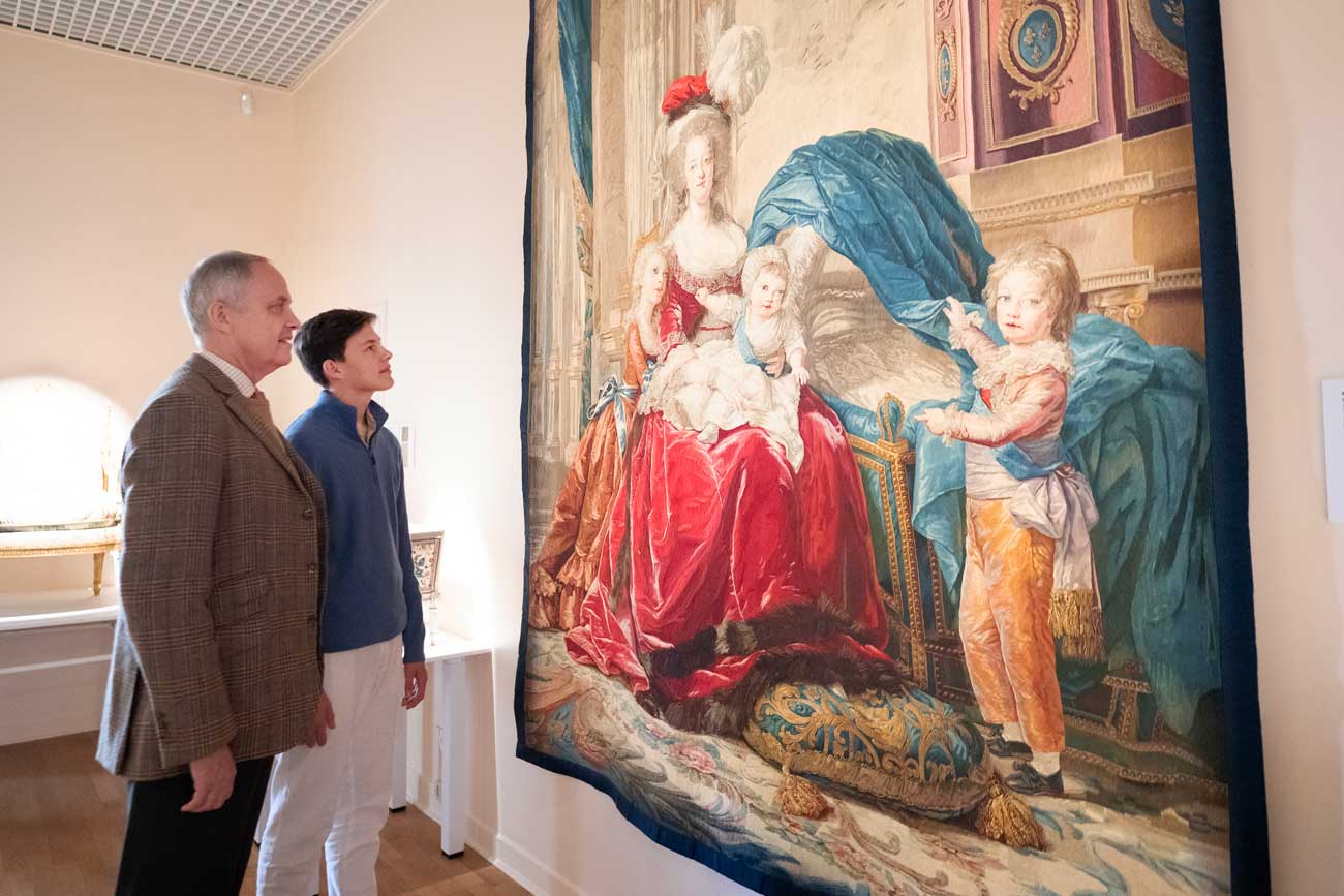 Le comte de Paris et son fils aîné admirent une tapisserie (Photo : David Nivière)