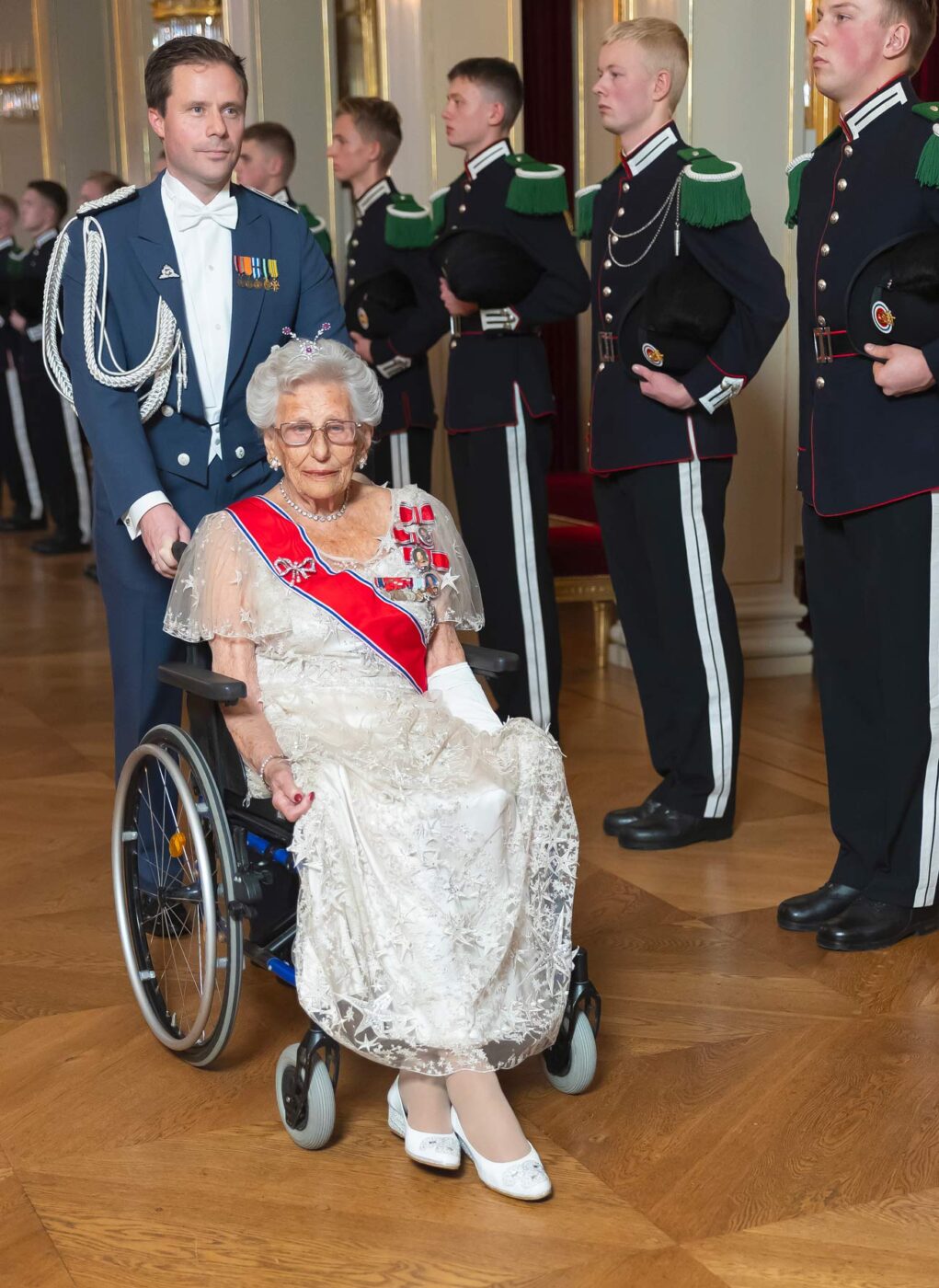 La princesse Astrid, sœur aînée du roi Harald, participe aussi chaque année à cette soirée. La princesse âgée de 93 ans n’aurait pas manqué cet événement, malgré ses difficultés pour se déplacer. La princesse Astrid portait son habituel diadème d’aigrettes, un diadème formant deux petites antennes au bout desquelles sont sertis des rubis.