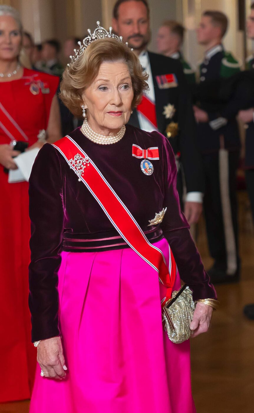 La reine Sonja portait elle aussi un diadème. La reine Sonja avait opté pour son diadème de perles et de diamants ayant été offert en 1896 à la princesse Maud par ses parents, le roi Edward VII du Royaume-Uni, à l’occasion de son mariage avec le prince Carl de Danemark. En 1905, la Norvège a pris son indépendance de la Couronne de Suède et le prince Carl a été élu premier roi de Norvège. Il régnera sous le nom de Haakon VII. Le roi Haakon VII instaura cette tradition d’organiser annuellement ce gala en l’honneur des députés, et ce, dès 1906.