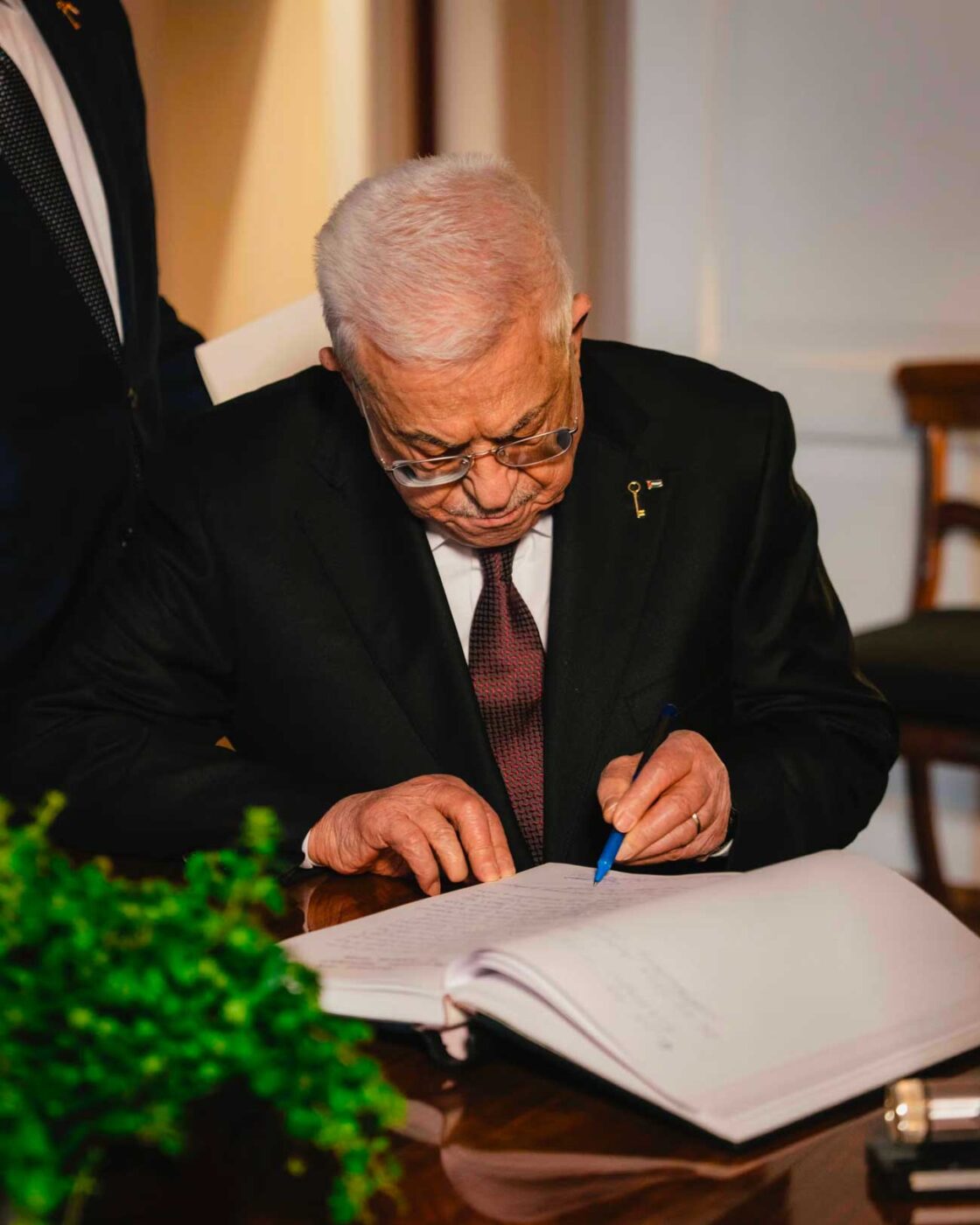 Le président Mahmoud Abbas signe le livre d’honneur du palais royal d’Oslo (Photo : Ola Vatn, Det kongelege hoffet)