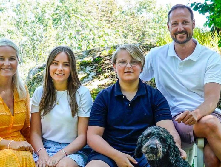La famille héritière de Norvège assiste à la parade des enfants avec son nouveau chien devant sa résidence