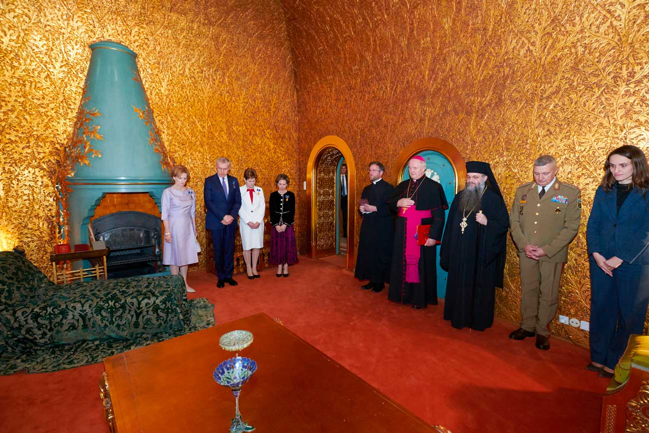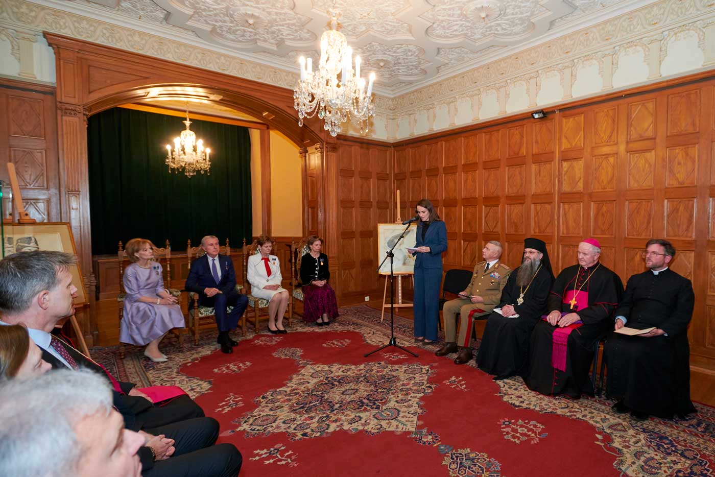 Le père archimandrite David Petrovici, exarque de la zone montagneuse de l’archidiocèse de Bucarest de l’Église orthodoxe roumaine, l’archevêque Aurel Percă de l’archidiocèse catholique de Bucarest, et le père Nevsky Everett de l’Église anglicane de Bucarest étaient présents au château de Pelișor. Après la célébration dans la Salle d’honneur, la famille Royale, les dignitaires de l’État et les représentants des différentes confessions se sont rendus dans la Salle dorée du château de Pelișor, où repose le cœur de la reine Marie, pour prier et observer un moment de silence.