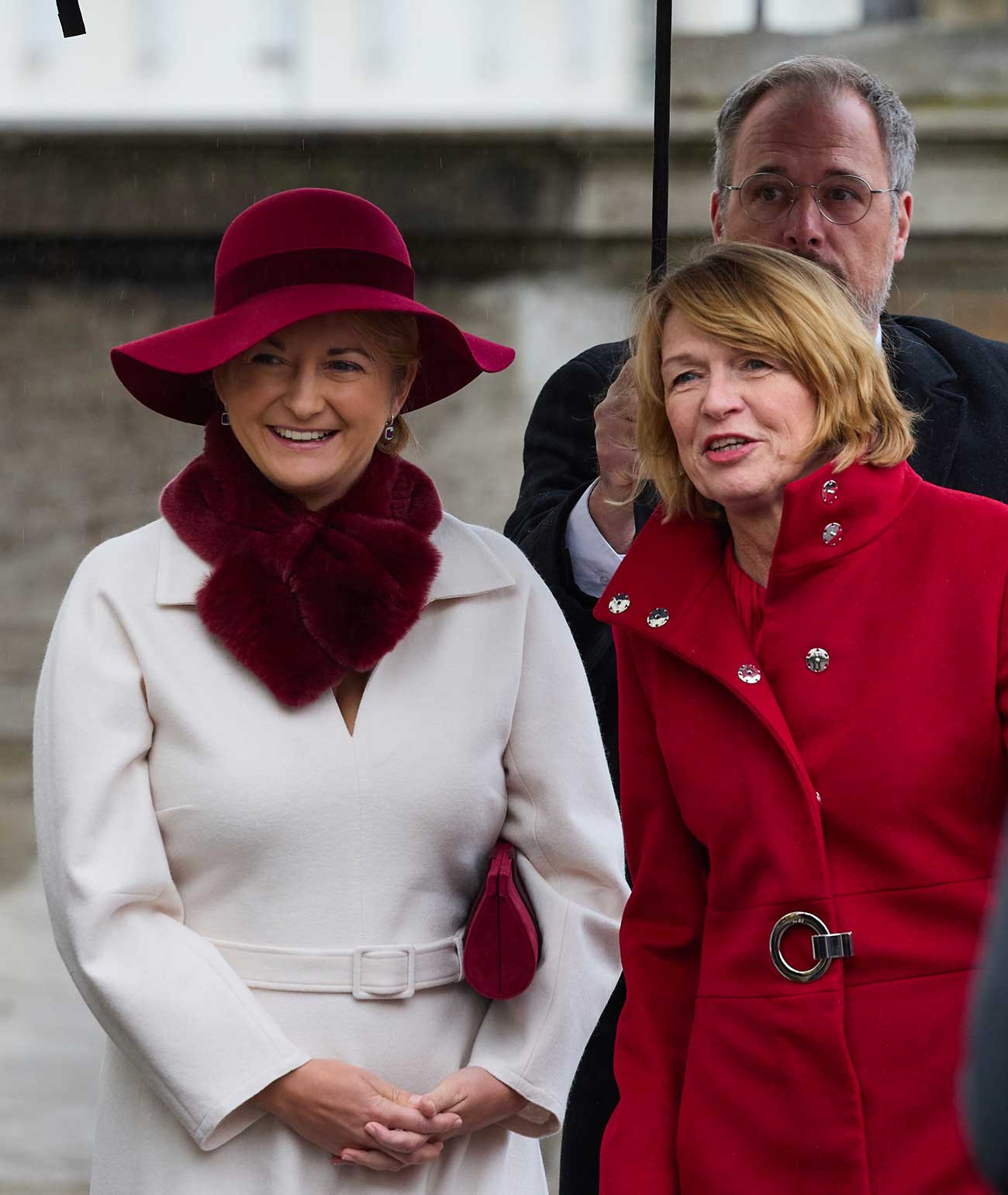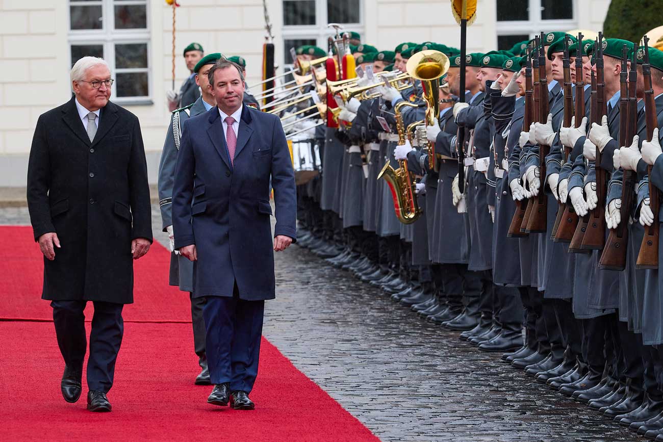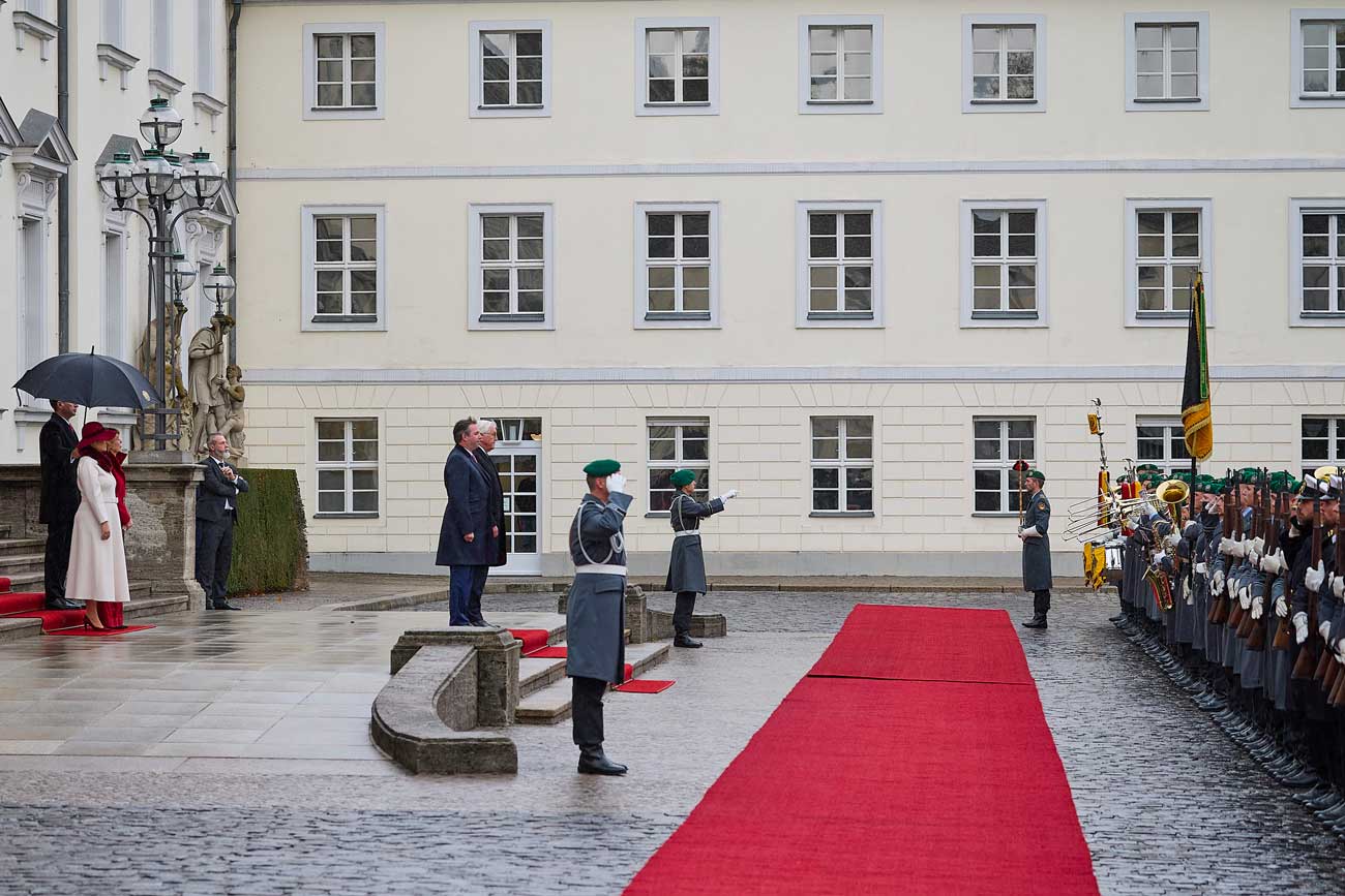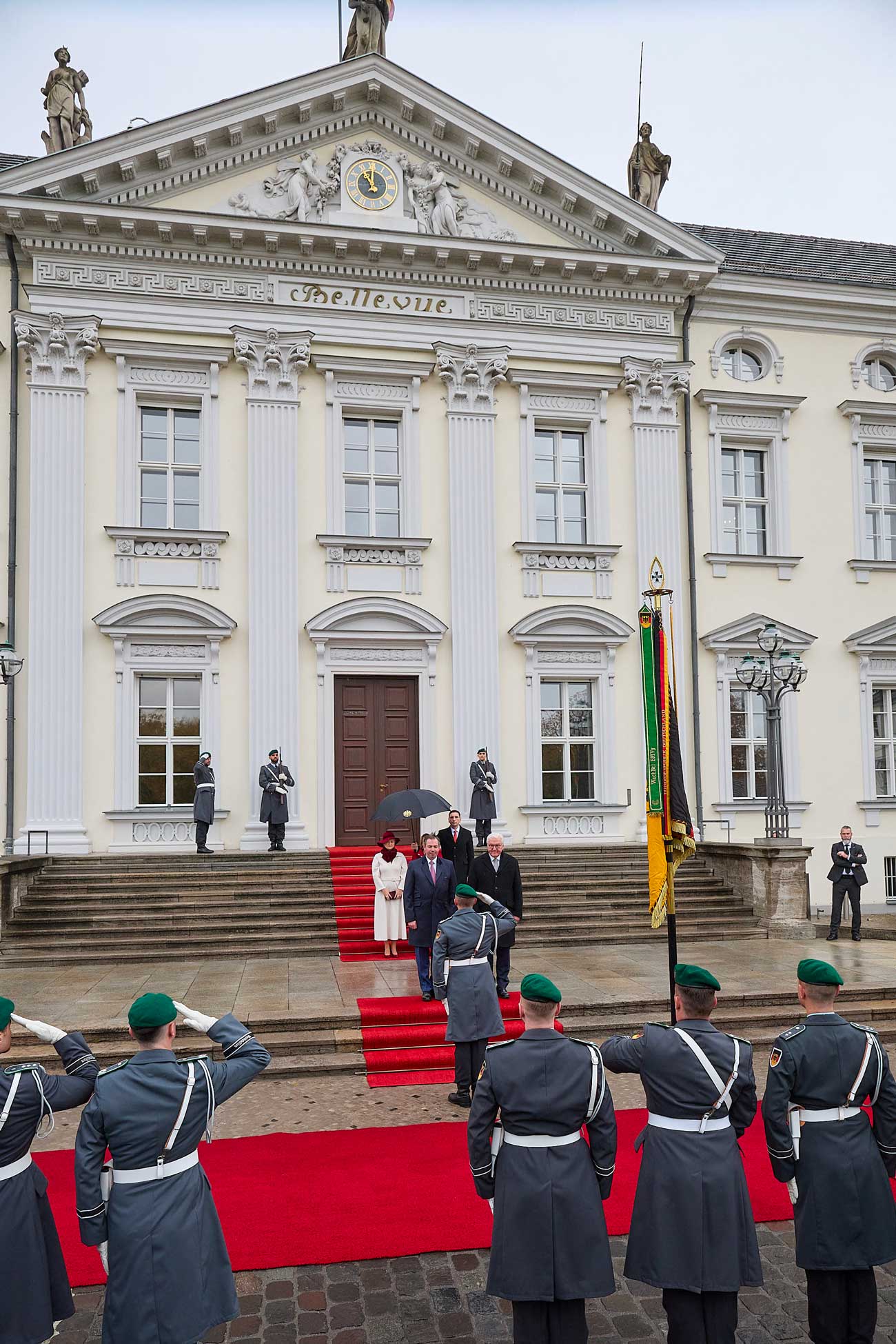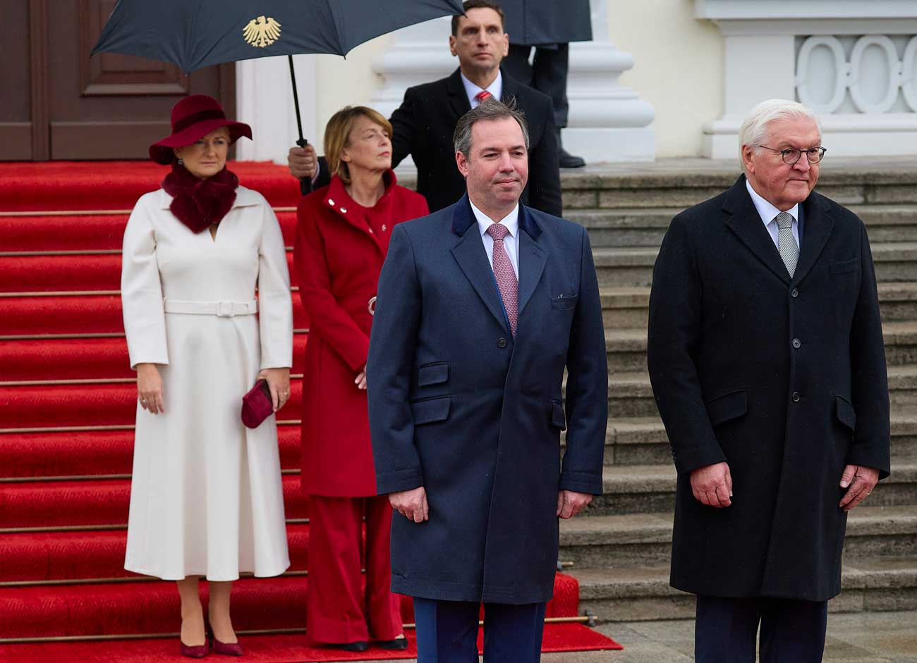 Le grand-duc Guillaume et la grande-duchesse Stéphanie ont été accueillis sur le tapis rouge déployé devant le château de Bellevue, la résidence officielle des présidents allemands. Elke Büdenbender, l’épouse du président allemand, était également présente pour accueillir leurs invités luxembourgeois. Le grand-duc Guillaume a passé en revue les troupes puis le couple présidentiel et le couple grand-ducal ont écouté les deux hymnes nationaux. Ils ont ensuite rejoint l’intérieur du palais pour signer le livre d’honneur.