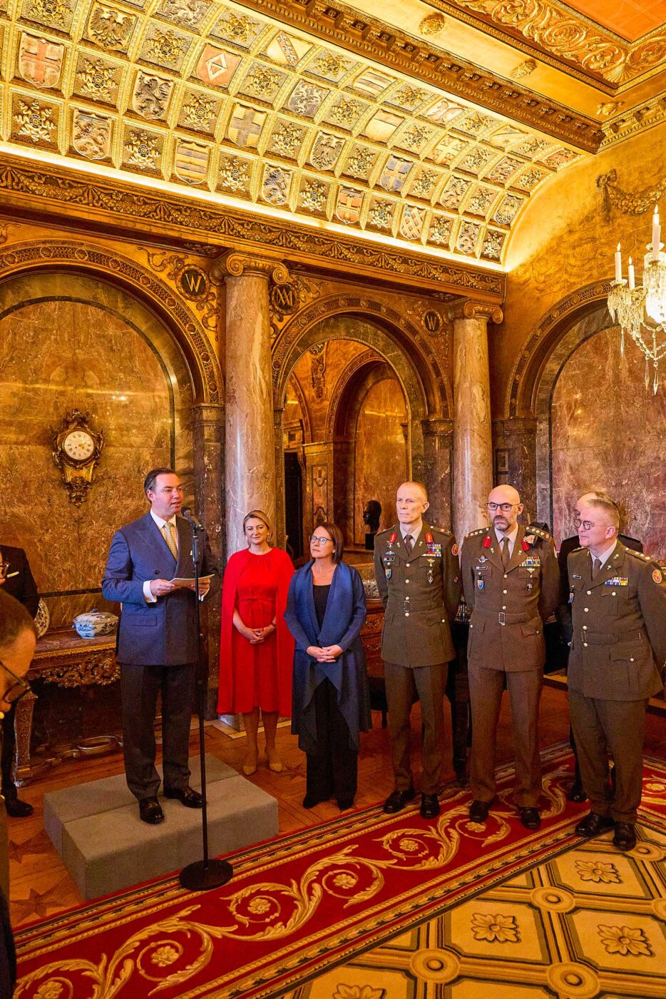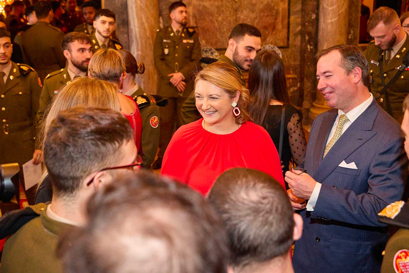 C’est dans une ambiance de fête, devant le grand sapin de Noël aux décorations rouges et dorées, que le couple grand-ducal a reçu les policiers et les soldats du pays ce 9 décembre. Les soldats et policiers sont habituellement mobilisés sur des missions internationales, mandatés par l’ONU, l’OTAN et l’Union européenne. La ministre de la Défense, anciennement maréchale de la Cour grand-ducale, Yuriko Backes, était présente.
