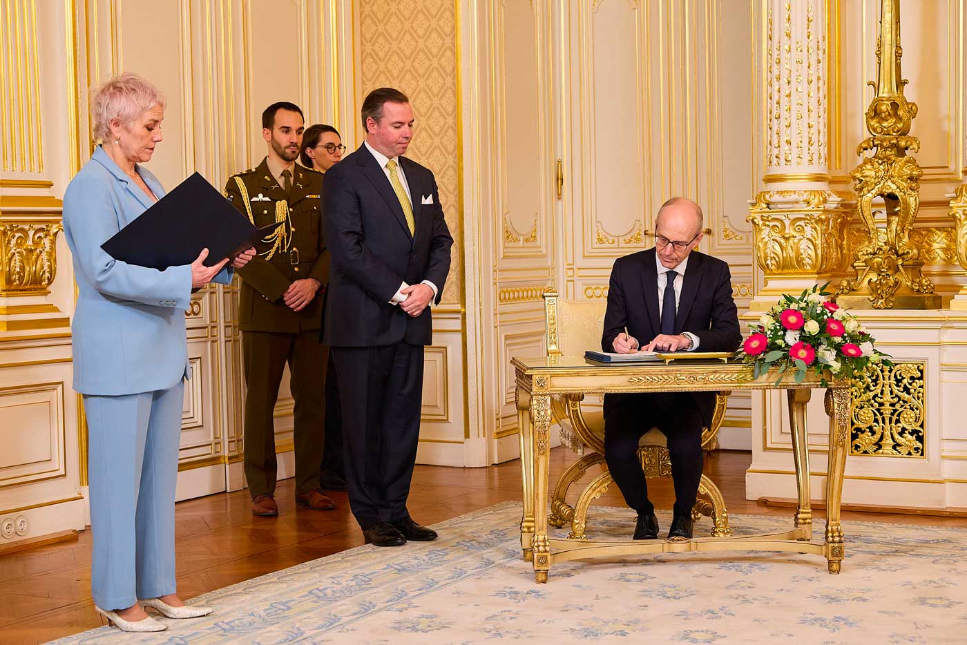 La nouvelle Constitution luxembourgeoise, entrée en vigueur en juillet 2023, a modifié la formule du serment. Jusqu’alors, la formule était : « Je jure fidélité au Grand-Duc, obéissance à la Constitution et aux lois de l’État ». L’article 88 de la Constitution est dorénavant : « Je jure d’observer la Constitution et les lois et de remplir ma fonction avec intégrité, exactitude et impartialité. ». La Chambre des députés explique que l’objectif de cette modification est de souligner « que les fonctionnaires publics doivent allégeance à l’État de droit et non au Grand-Duc. Ainsi, la référence faite au Chef de l’État est abandonnée. » Le nouveau ministre prononce cette phrase en répétant le serment. La maréchale de la Cour, Sasha Baillie, lit ensuite l’arrêté grand-ducal signé par le Grand-Duc, qui confirme la nomination et la prise de fonction.