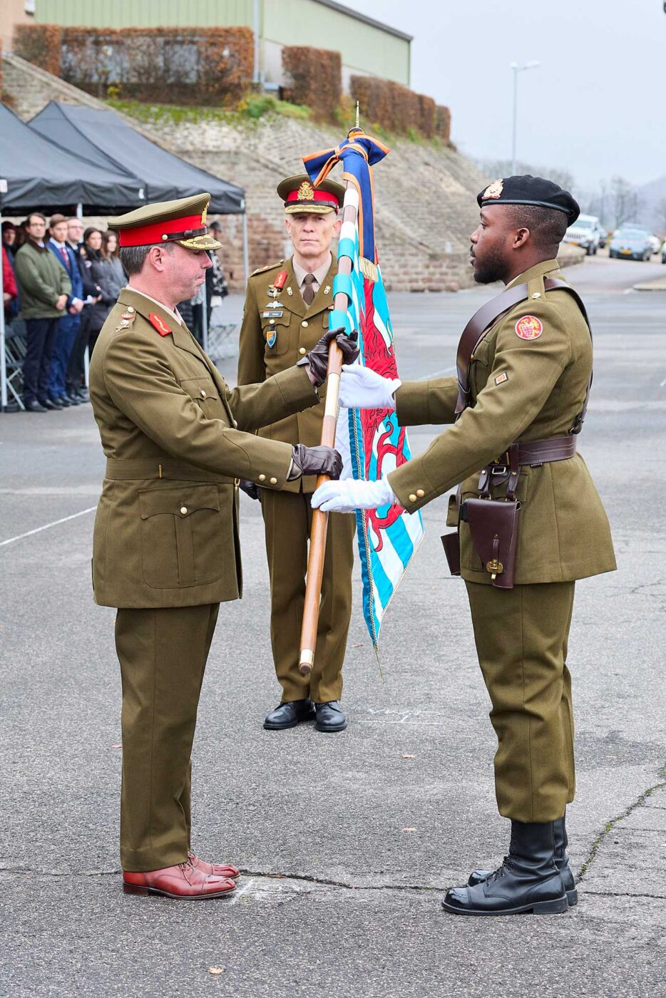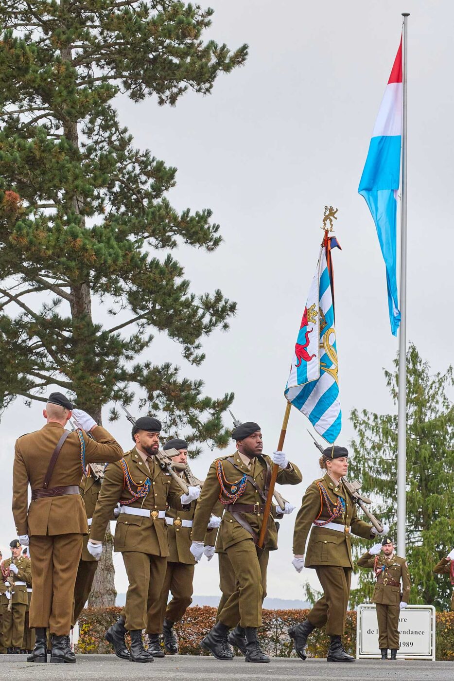 Après l’allocution de la ministre de la Défense, le grand-duc Guillaume a procédé à la remise du nouveau drapeau de l’Armée luxembourgeoise. Le Luxembourg reconnaît deux drapeaux nationaux : le drapeau tricolore et le Lion rouge. L’un est le drapeau classique aux bandes horizontales bleu blanc rouge, l’autre est un drapeau composé de dix bandes blanches et bleues sur lequel figure un lion rouge. Le drapeau de l’Armée reprend le Lion rouge d’un côté et de l’autre, le lion est remplacé par le monogramme du souverain.