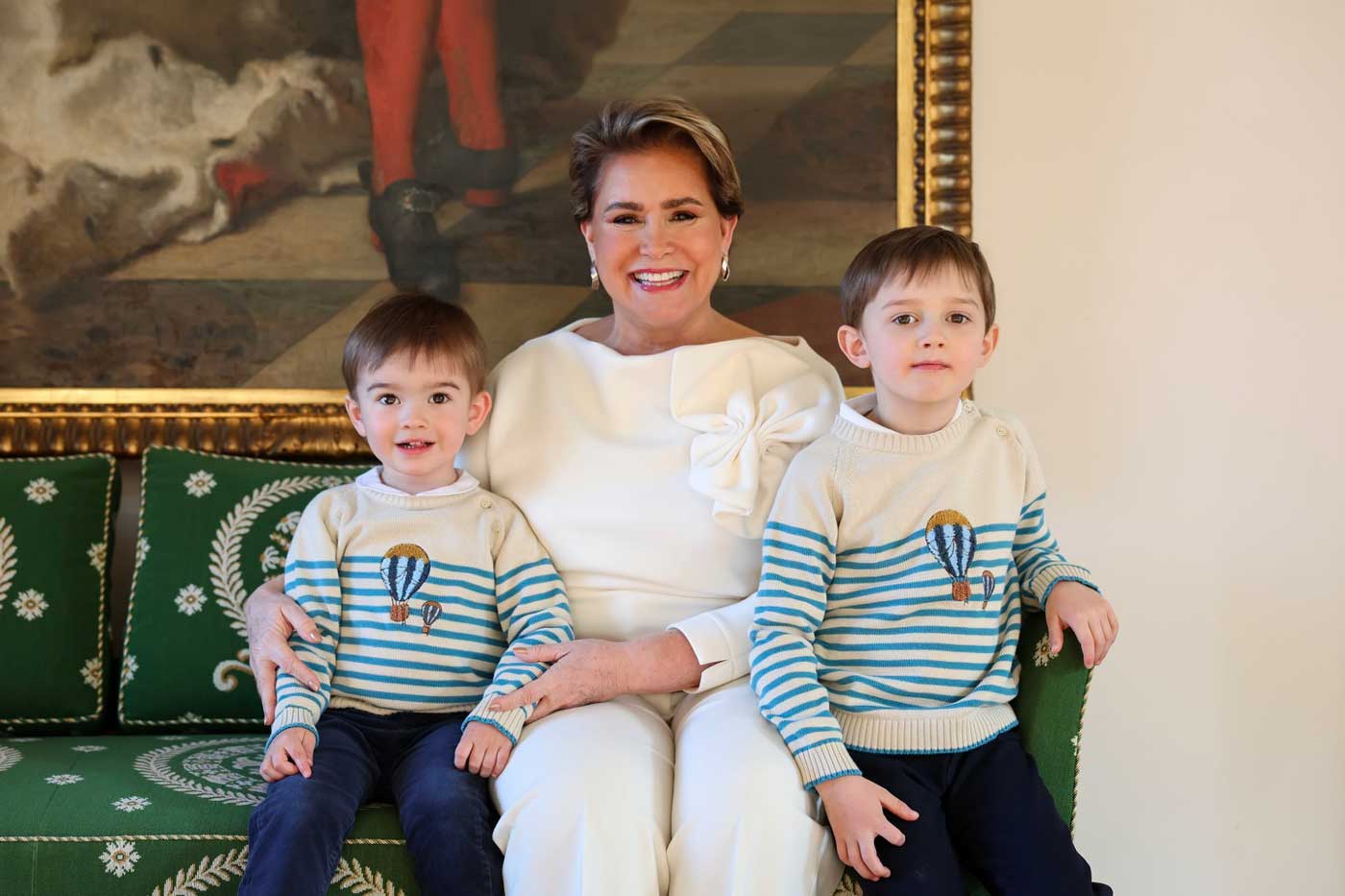 La grande-duchesse Maria Teresa avec les deux fils du grand-duc Guillaume, qui portent des pulls identiques (Photo : Collection Privée / Sophie Margue)