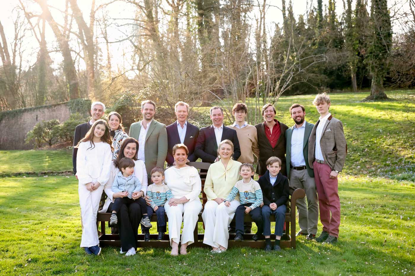 La grande-duchesse Maria Teresa et le grand-duc Henri avec leurs cinq enfants et deux beaux-enfants au château de Berg pour une réunion familiale exceptionnelle. Sur le banc : la princesse Claire, la grande-duchesse Maria Teresa, la grande-duchesse Stéphanie et la princesse Alexandra. Derrière debout : Nicolas Bagory, le prince Félix, le grand-duc Henri, le grand-duc Guillame, le prince Louis et le prince Sébastien (Photo : Collection Privée / Sophie Margue)