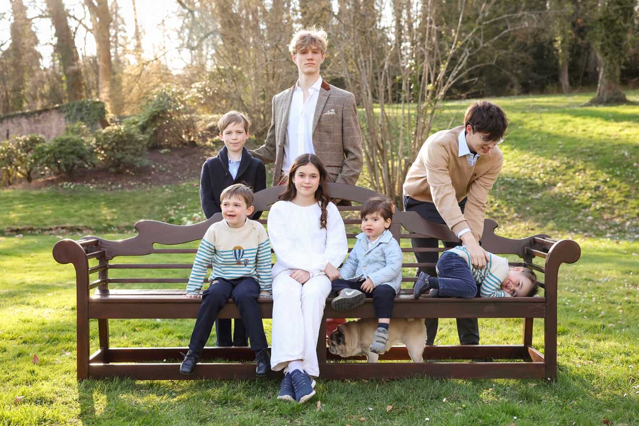 Sur le banc, le grand-duc héritier Charles de Luxembourg, la princesse Amalia de Nassau, le prince Balthazar de Nassau, le prince François de Luxembourg. Derrière debout, le prince Liam de Nassau, le prince Noah de Nassau et le prince Gabriel de Nassau qui chatouille son cousin (Photo : Collection Privée / Sophie Margue)