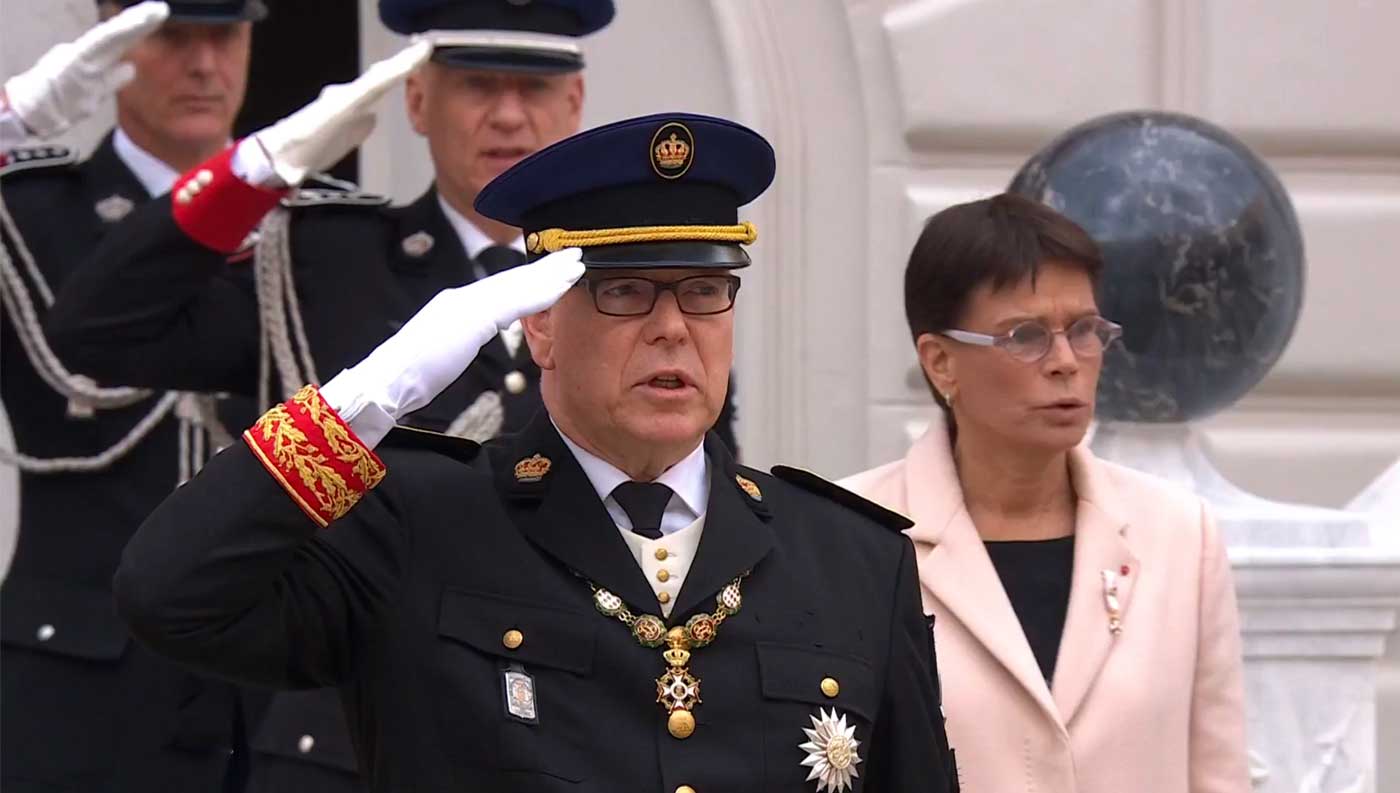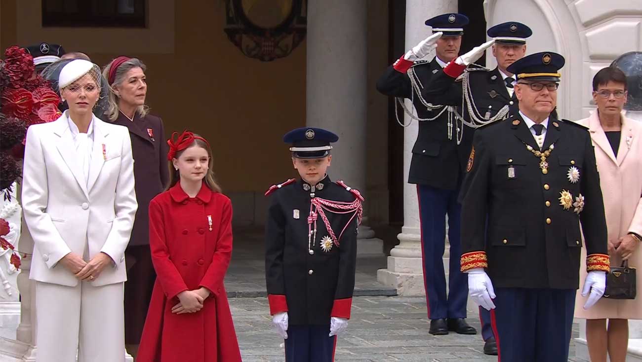 Dans la cour d’honneur, sont réunis les membres de la famille princière. La princesse Charlène, le prince héréditaire Jacques, la princesse Gabriella mais aussi la princesse Caroline de Hanovre et la princesse Stéphanie se tiennent non loin du prince Albert II tout au long de la cérémonie, qui a débuté par la sonnerie aux honneurs. L’hymne a été interprété à capella par l’ensemble des personnes présentes, y compris par le prince héréditaire Jacques, qui a chanté pour la première fois les paroles tout en faisant le salut militaire.