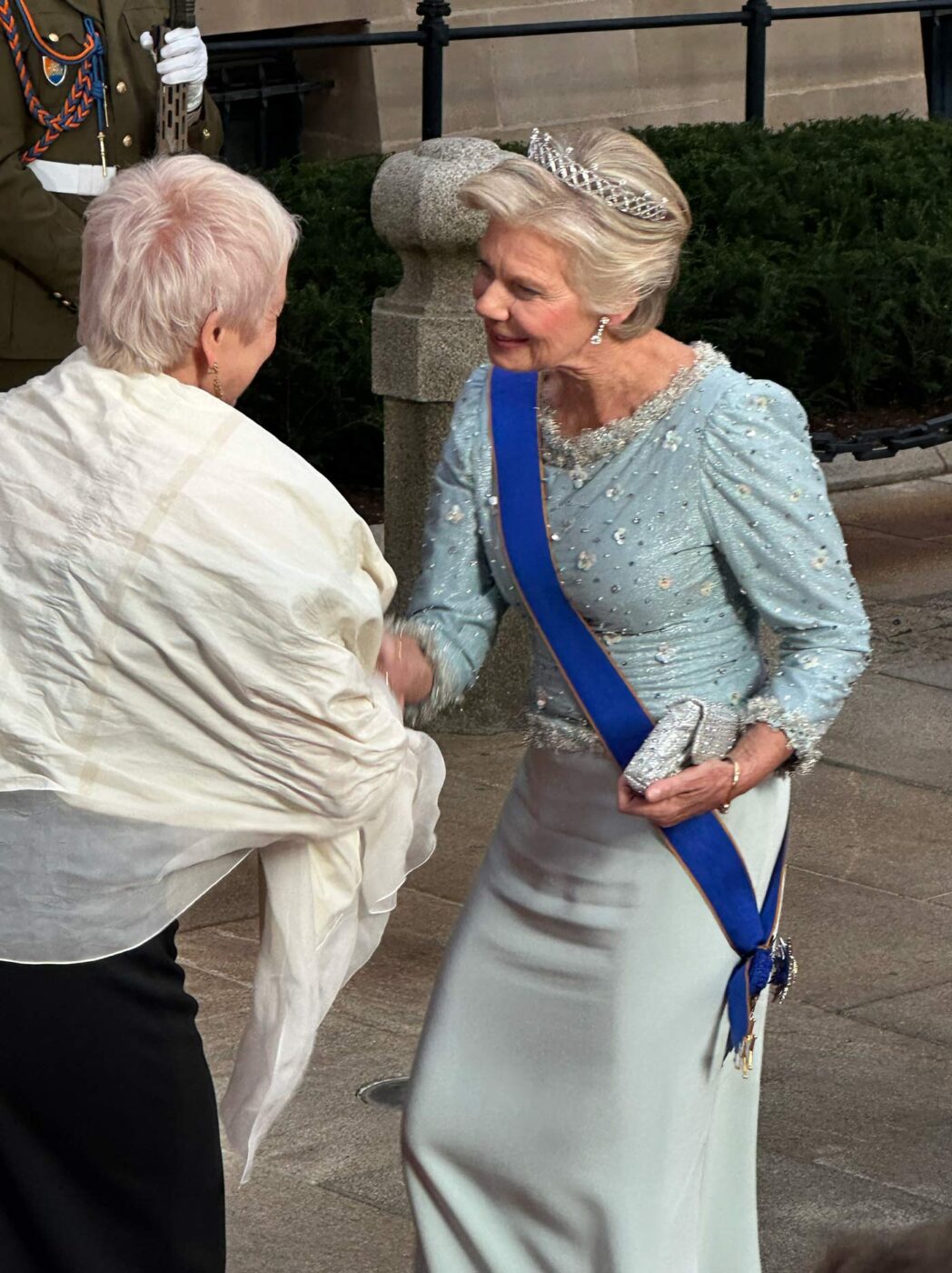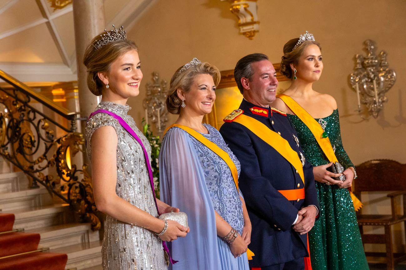 Les reines et princesses portaient leur diadème et une pluie de diamants s’est abattue au Luxembourg. La reine Mathilde portait le bandeau des diadèmes des Neuf Provinces, la reine Máxima portait le diadème de saphirs, la princesse Élisabeth portait le diadème reçu pour ses 18 ans et la princesse Amalia portait le diadème de diamants de la reine Emma. Du côté luxembourgeois, la princesse Claire portait le diadème Chaumet d’émeraude. Les sœurs du grand-duc Henri portaient elles aussi un diadème, tout comme une sœur et une belle-sœur du Stéphanie du côté des comtes de Lannoy.