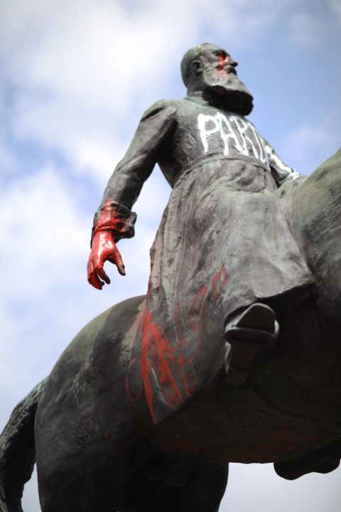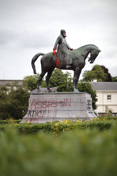 Les tagueurs ont alors inscrit plusieurs insultes sur le piédestal et les yeux du roi Léopold II ont été recouverts de couleur rouge, évoquant le sang. Des discussions sont en cours concernant le futur du monument.
