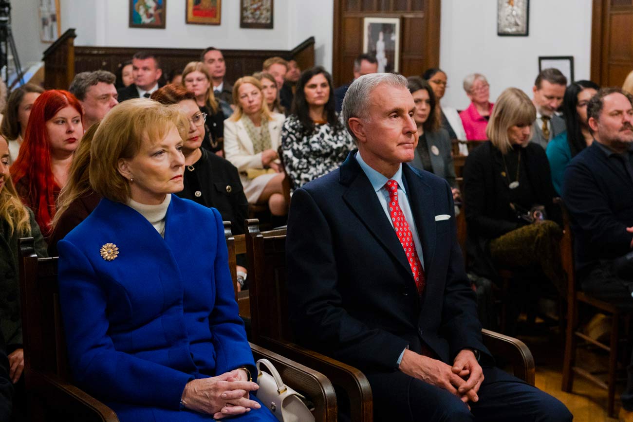 Margareta et Radu de Roumanie sont accueillis devant l’entrée de l’église anglicane de Bucarest (Photo : Daniel Angelescu, Casa Majestății Sale)