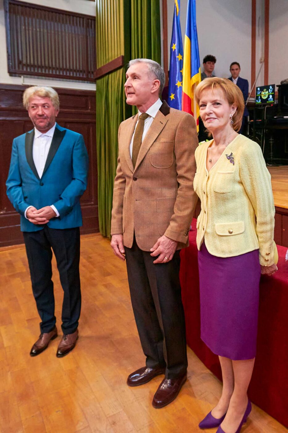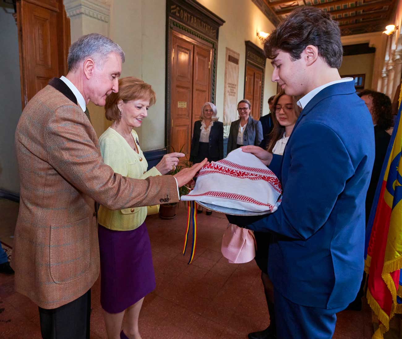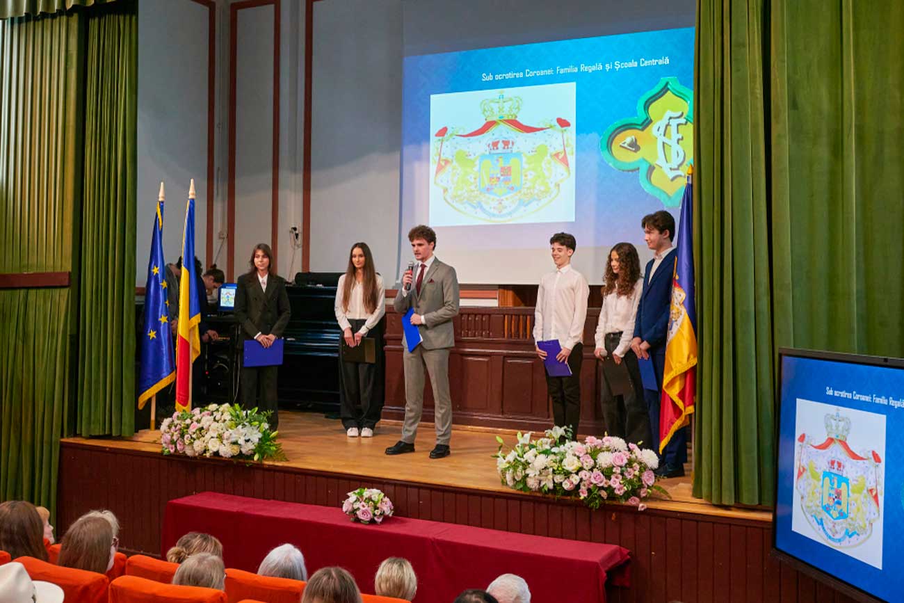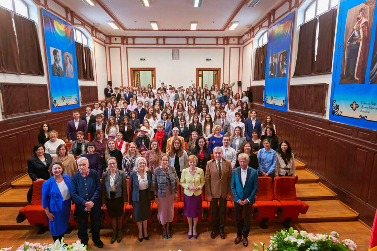 Dans l’amphithéâtre de l’école, en présence d’un grand nombre d’élèves et d’enseignants, Margareta et le prince Radu ont assisté à la présentation des élèves retraçant l’histoire de l’établissement, dont l’existence est étroitement liée à la famille royale.