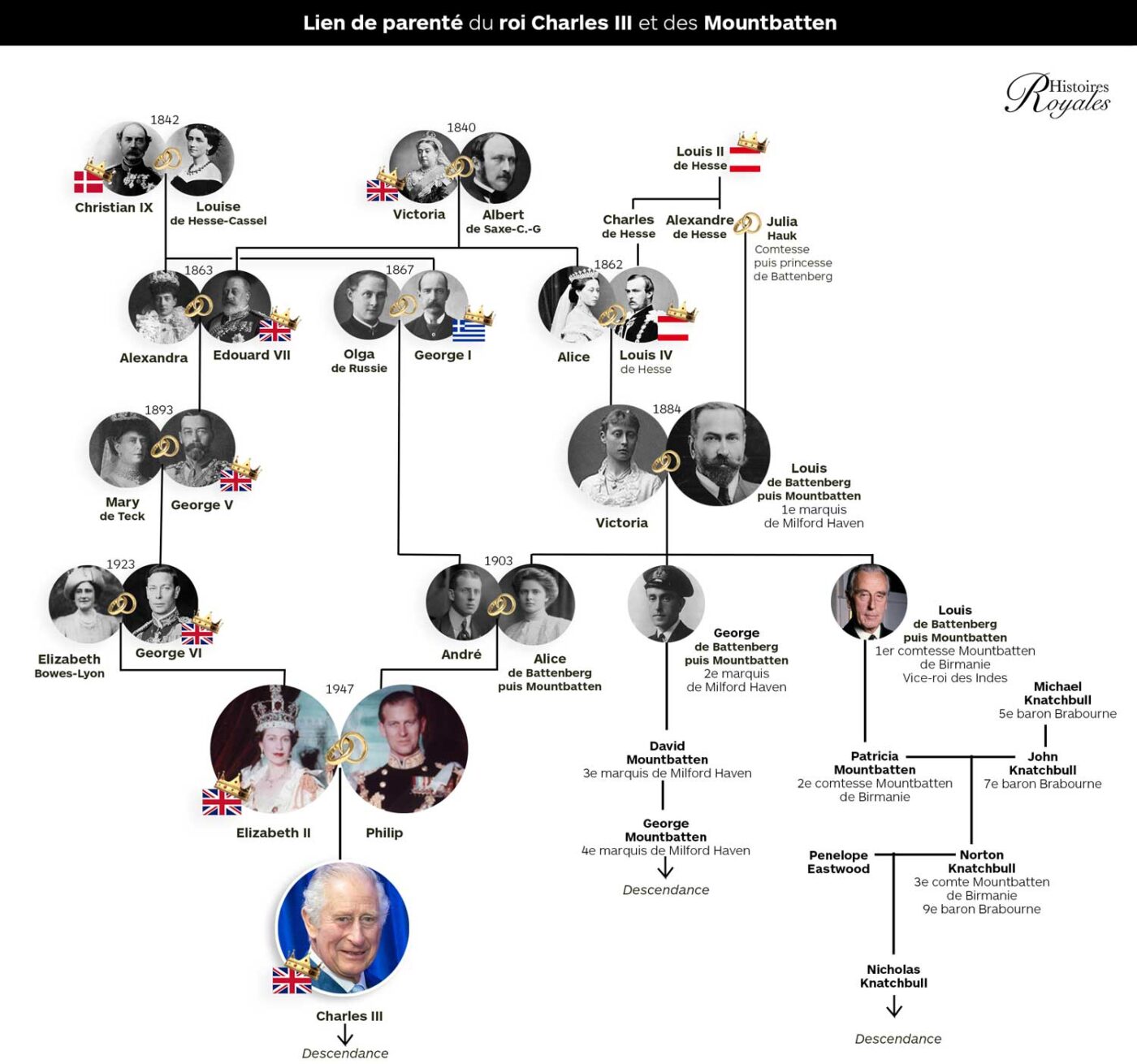 Liens de parenté de la famille royale britannique avec leurs cousins Mountbatten et Knatchbull (Image : Histoires Royales)